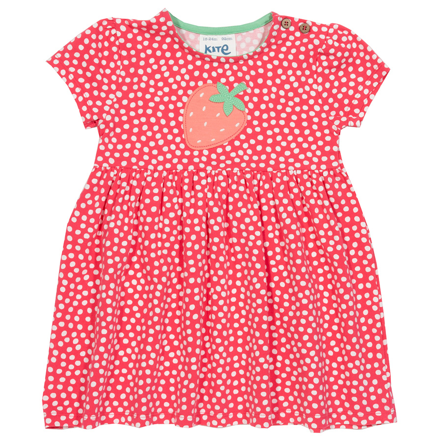 The perfect dress for a summer full of picnics this beautiful dress is a must-have for the sunny season. Featuring our dotty print and a gorgeous appliqué strawberry this dress will keep your little one looking stylish and feeling comfy. Made from
