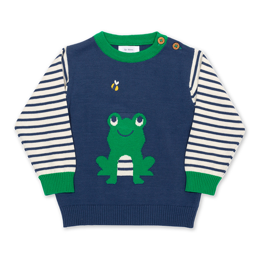 Frogs are pretty fab! It is said that they can see in any direction and always have their eyes open even when they’re sleeping. To celebrate these little hoppers this knit jumper features an intarsia frog and bee design with contrast stripy sleeves