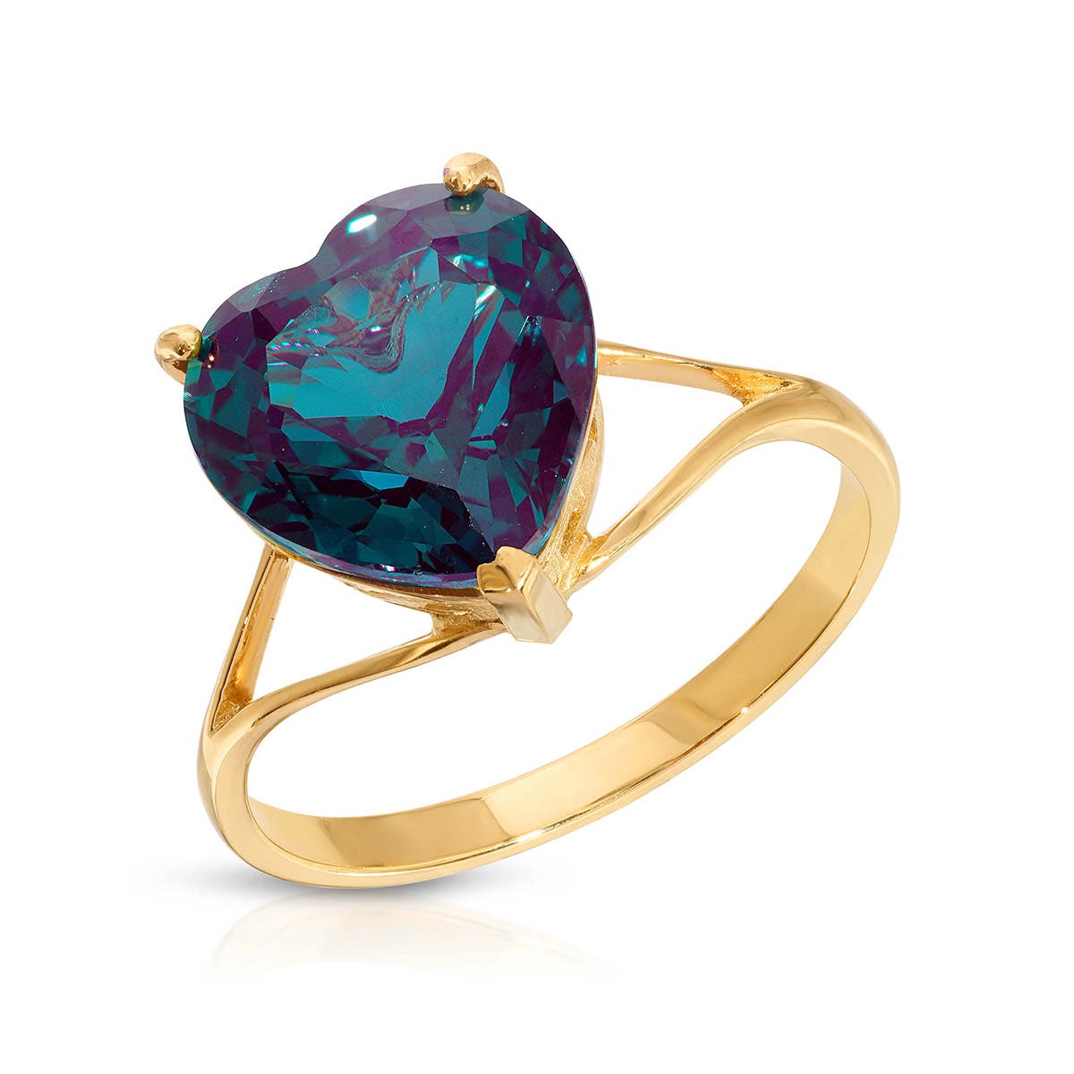 A solid 18ct gold split shank elegantly supports a single lab grown 5ct alexandrite in this romantic ring design. Precision cut into a heart shape, the stone is almost internally flawless and boasts terrific colour changing qualities. Take a look at alexandrite in natural light and you’ll see intense flashes of emerald green mixed with hints of blue. Observe alexandrite in incandescent light and the stone will change to a deep purple. Unsurprisingly, this unique colour changing property makes alexandrite one of the rarest and most sought after gemstones on the market.Single 5ct lab grown alexandrite. Heart cut. Available in sizes A-Z including half sizes.Lab grown gemstones hold the same optical and physical properties as their natural counterparts and offer a superlative cut, colour and clarity. Size: 10.4 mm (0.41 in). Material: 18ct Gold. Total metal weight: 3.2 gr. 1 heart shaped lab grown alexandrite (10 x 10 mm) = 5 ct. Colour: Colour Changing. Stone cut: Heart Shaped. Anniversary: 55th Anniversary. Birthstone: June.