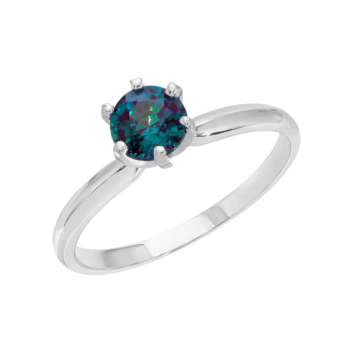 A single round brilliant cut lab grown alexandrite stone sits on top of this classically designed solitaire ring. Cut to perfection, alexandrite displays intense flashes of green and purple hues when exposed to various lighting conditions. Supported by a six prong setting, the simple design allows for extra security without taking the focus away from this majestic stone. Handcrafted in solid 9ct white gold, the complementary colours add balance to this superior ring.Single 0.6ct lab grown alexandrite. Round brilliant cut. Available in sizes A-Z including half sizes.Lab grown gemstones hold the same optical and physical properties as their natural counterparts and offer a superlative cut, colour and clarity. Size: 5.8 mm (0.23 in). Material: 9ct White Gold. Total metal weight: 1.4 gr. 1 round cut lab grown alexandrite (5 x 5 mm) = 0.6 ct. Colour: Colour Changing. Stone cut: Round Cut. Anniversary: 55th Anniversary. Birthstone: June.