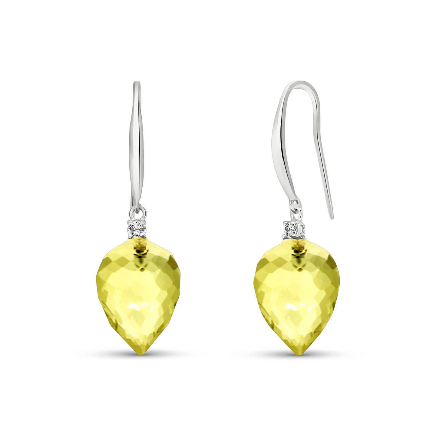Lemon Quartz & Diamond Fish Hook Earrings handcrafted in solid white gold. Two genuine quartz, total 18 ct, two diamonds, total 0.1 ct for both earrings combined. Pointed briolette cut. Size: 10.2 x 34.8 mm (0.4 x 1.37 in). Material: 9ct White Gold. Total metal weight: 3.8 gr. 2 pointed briolette cut lemon quartz (15 x 10 mm) = 18 ct total for pair. 2 round cut diamonds (K colour, I3 clarity) = 0.1 ct total for pair. Colour: Yellow. Stone cut: Pointed Briolette Cut.