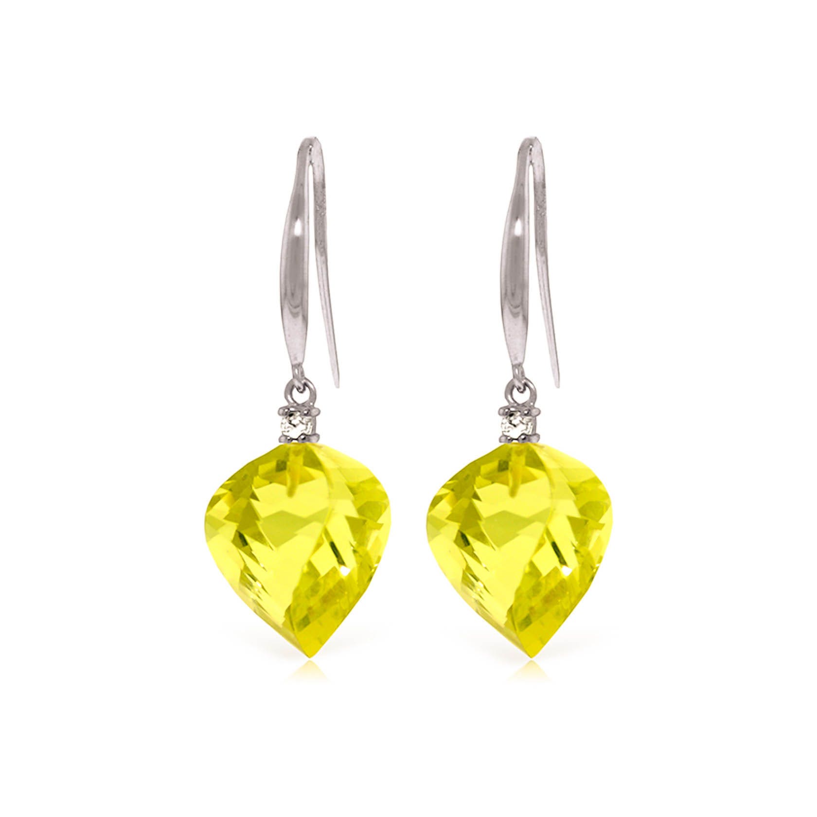 Lemon Quartz & Diamond Fish Hook Earrings handcrafted in solid white gold. Two genuine quartz, total 21.5 ct, two diamonds, total 0.1 ct for both earrings combined. Twisted briolette cut. Size: 12.7 x 34.8 mm (0.5 x 1.37 in). Material: 9ct White Gold. Total metal weight: 4.4 gr. 2 twisted briolette cut lemon quartz (15 x 13 mm) = 21.5 ct total for pair. 2 round cut diamonds (K colour, I3 clarity) = 0.1 ct total for pair. Colour: Yellow. Stone cut: Twisted Briolette Cut.