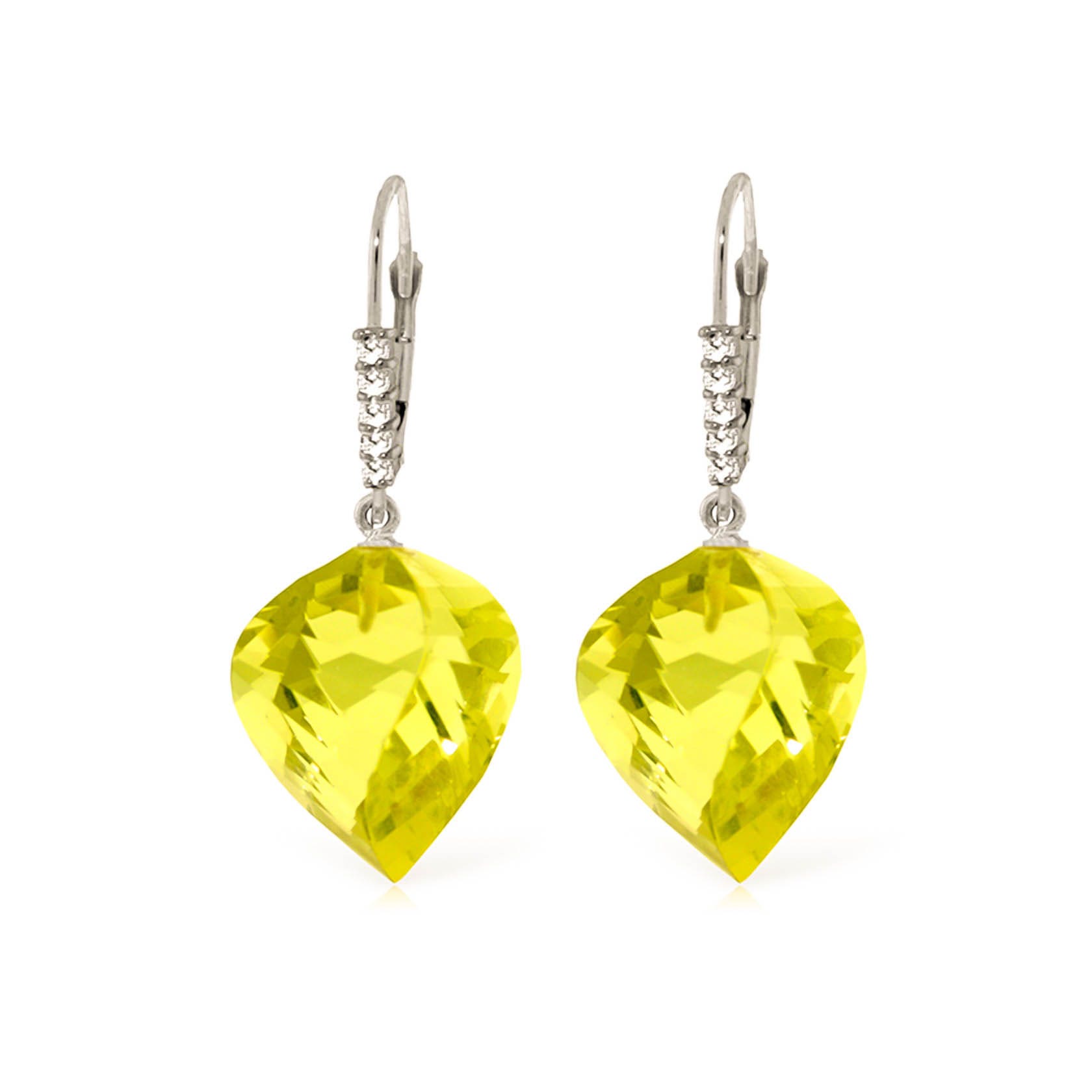 Lemon Quartz & Diamond Leverback Earrings handcrafted in solid white gold. Two genuine quartz, total 21.5 ct, ten diamonds, total 0.15 ct for both earrings combined. Twisted briolette cut. Size: 12.7 x 32.5 mm (0.5 x 1.28 in). Material: 9ct White Gold. Total metal weight: 4.7 gr. 2 twisted briolette cut lemon quartz (15 x 13 mm) = 21.5 ct total for pair. 10 round cut diamonds (K colour, I3 clarity) = 0.15 ct total for pair. Colour: Yellow. Stone cut: Twisted Briolette Cut.