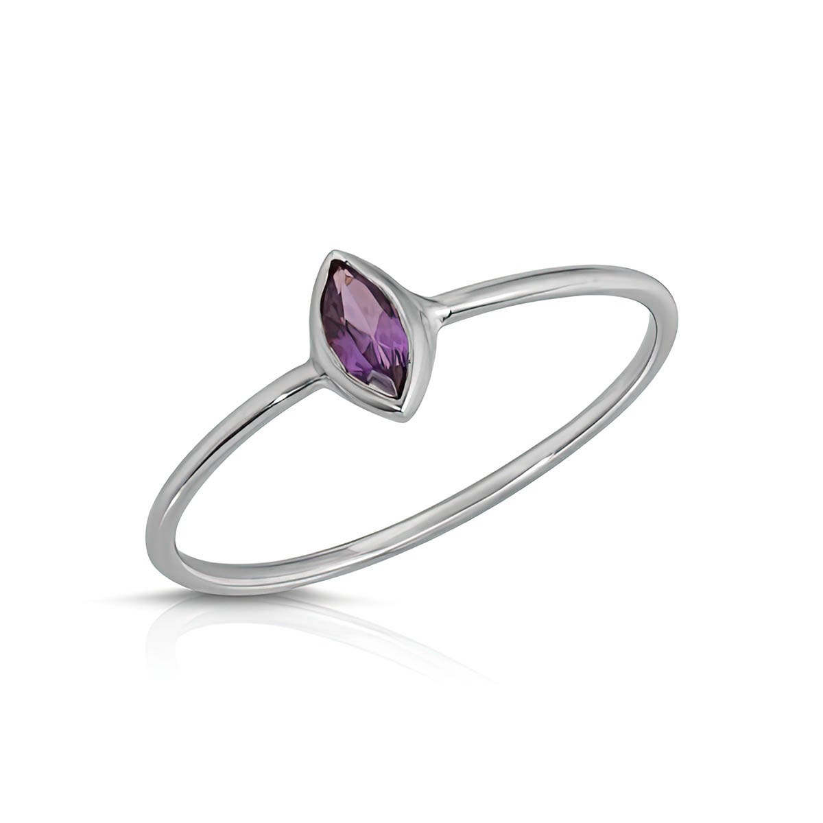 Amethyst Ring handcrafted in 9ct White Gold. Single 0.17 ct genuine amethyst. Marquise cut. Available from sizes H to Z including half sizes. Size: 1 x 19.8 mm (0.04 x 0.78 in). Material: 9ct White Gold. Total metal weight: 0.5 gr. 1 marquise cut amethyst (5 x 2.5 mm) = 0.17 ct. Colour: Purple. Stone cut: Marquise cut. Anniversary: 6th Anniversary. Birthstone: February.