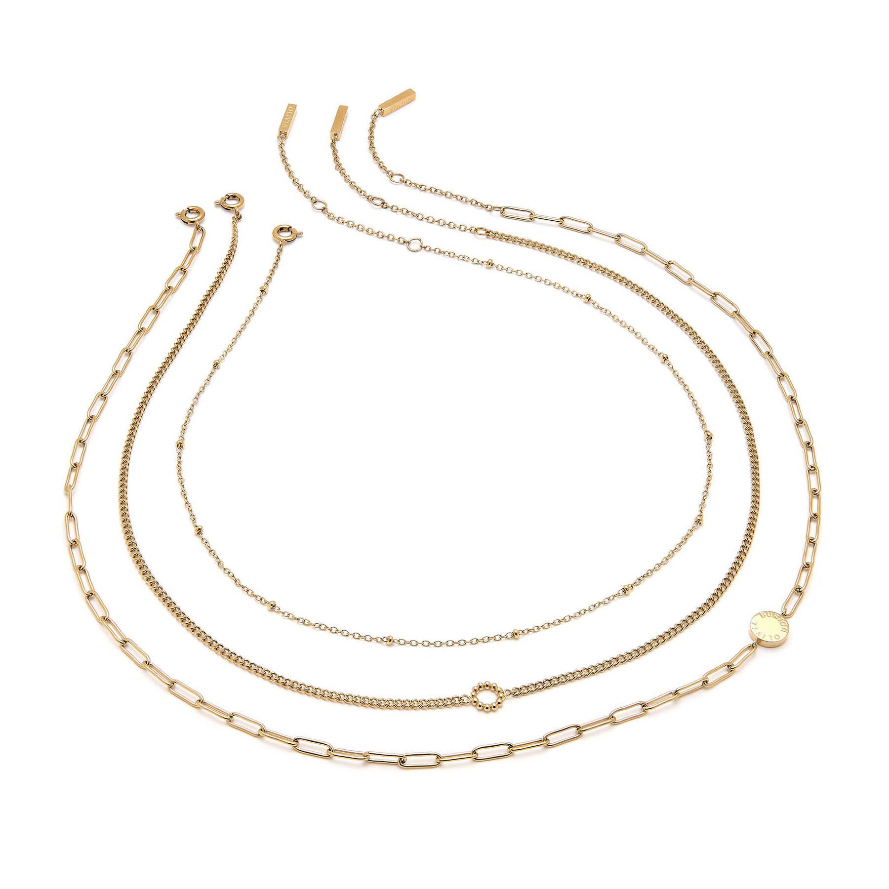 Flawless layering simplified. This Olivia Burton Women’s Classic Illusion Stacking Necklace Set in Gold Plated Stainless Steel features three styles of gold-plated chains, offering a mismatched style that works perfectly for layering or wearing individually. Material: Gold Plated Stainless Steel.
