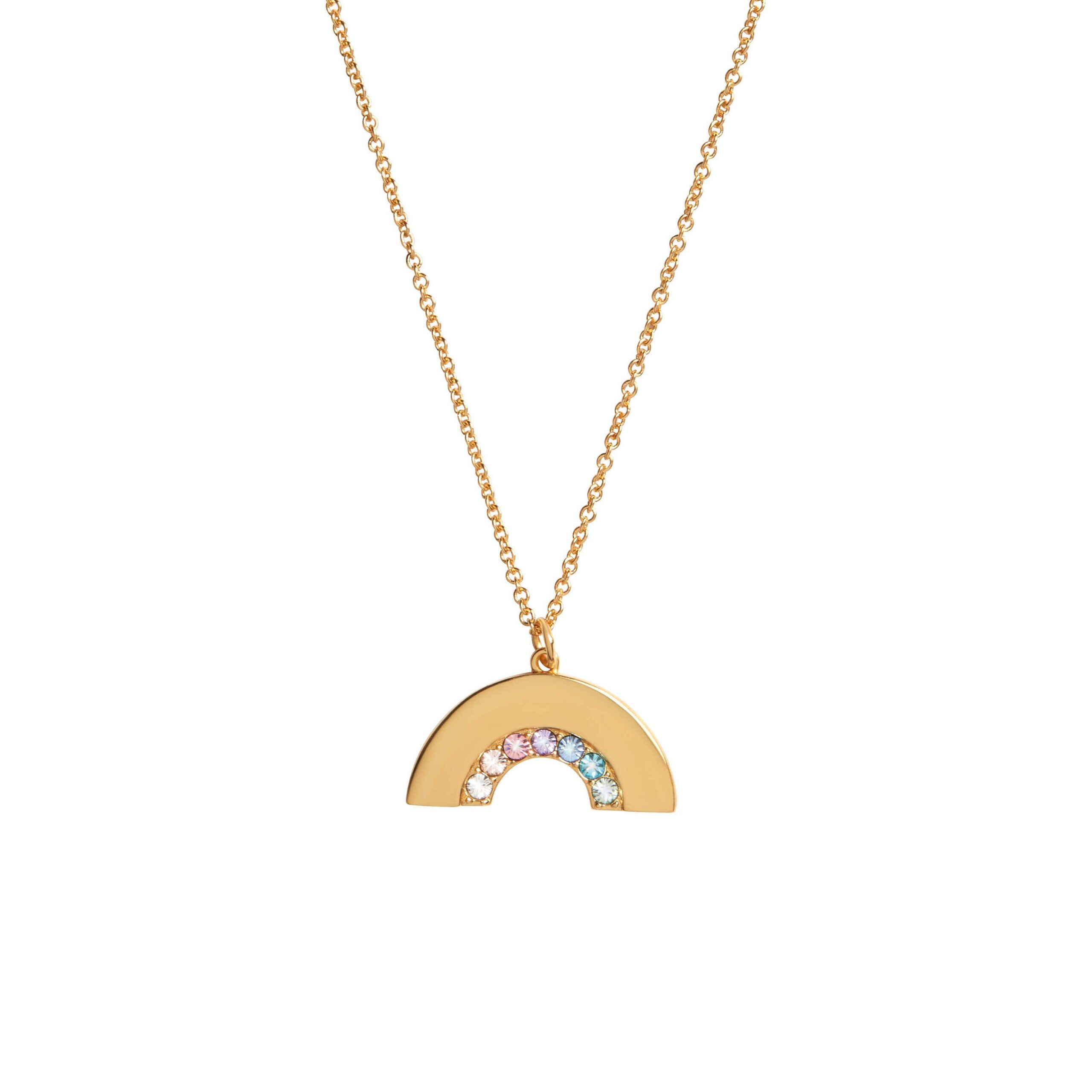 Simply beautiful. The Olivia Burton Women’s Crystal Rainbow Necklace in Gold Plated Stainless Steel features a gold plated rainbow-inspired silhouette delicately embellished with a variety of coloured crystals, creating a beautiful rainbow effect that adds a touch of sparkle and charm to any layered necklace look. Material: Gold Plated Stainless Steel. 7 round cut crystals. Colour: Clear. Stone cut: Round Cut.