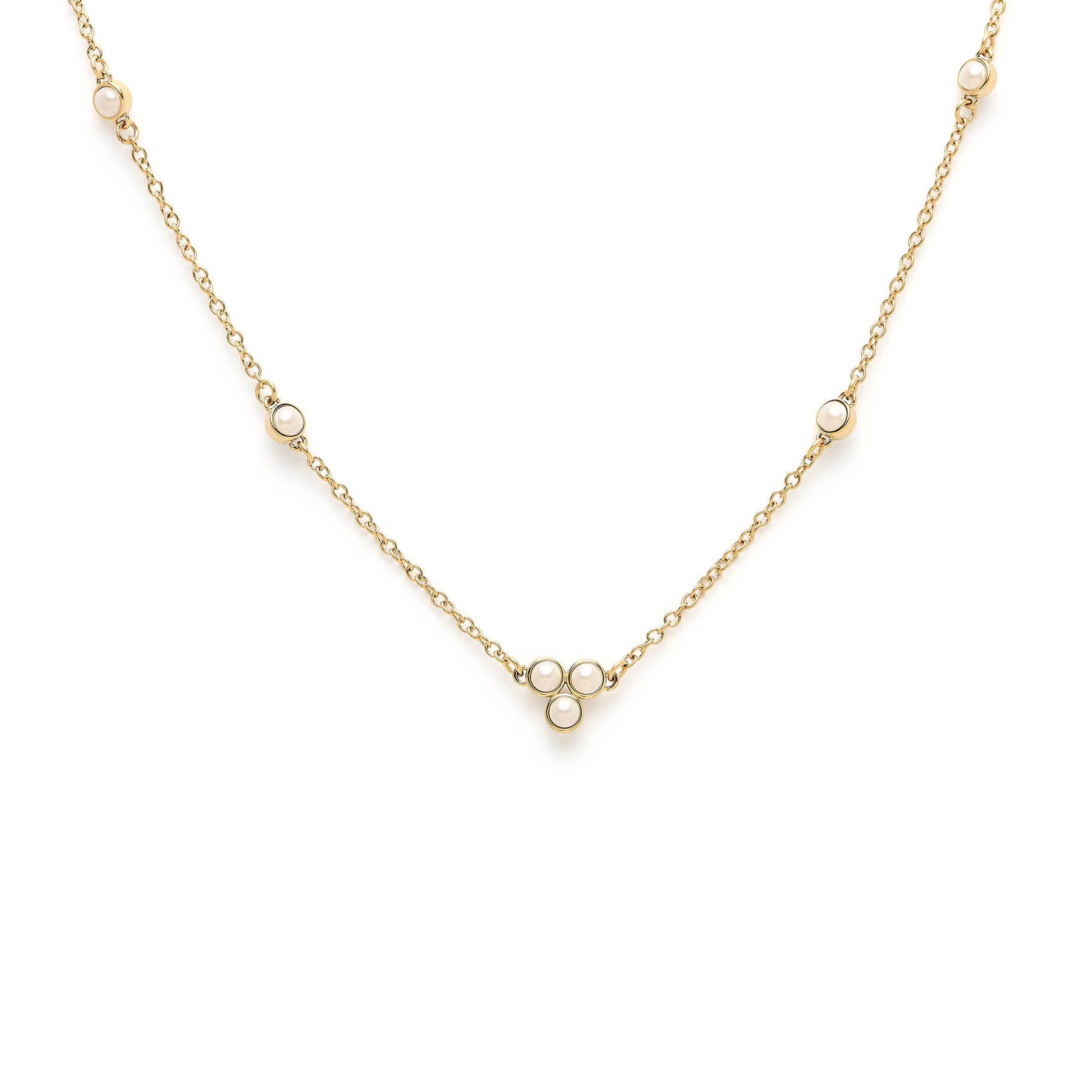 A perfect piece of jewellery to wear with an open buttoned white shirt, the Olivia Burton Women’s Mother Of Pearl Cluster Necklace in Gold Plated Stainless Steel features single pearls as a cluster of three dotted along a delicate gold plated chain. Beautifully British with a vintage touch, this necklace is an ideal addition to a jewellery collection. Material: Gold Plated Stainless Steel. 7 round cut mother of pearls. Colour: White. Stone cut: Round Cut. Anniversary: 3rd Anniversary, 30th Anniversary. Birthstone: June.