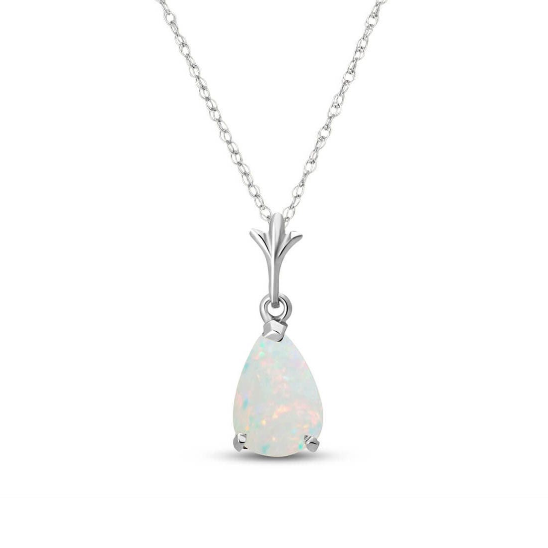 Opal Pendant Necklace handcrafted in solid white gold. Single 0.77 ct genuine opal. Pear cut. The pendant hangs from a white gold double link rope chain with spring clasp. Size: 6.1 x 17.3 mm (0.24 x 0.68 in). Material: 9ct White Gold. Total metal weight: 1.54 gr. 1 pear cut opal (9 x 6 mm) = 0.77 ct. Colour: White. Stone cut: Pear Cut. Anniversary: 14th Anniversary. Birthstone: October.