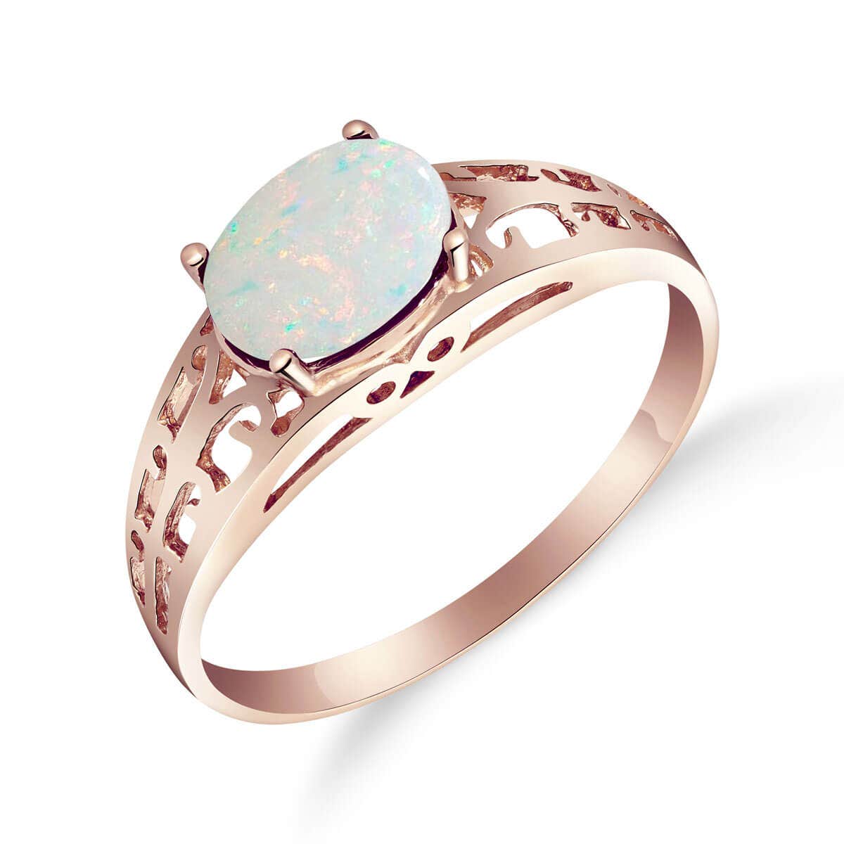 Opal Ring handcrafted in solid rose gold. Single 0.45 ct genuine opal. Oval cut. Available from sizes H to Z including half sizes. Size: 5.3 mm (0.21 in). Material: 9ct Rose Gold. Total metal weight: 1.5 gr. 1 oval cut opal (7 x 5 mm) = 0.45 ct. Colour: White. Stone cut: Oval Cut. Anniversary: 14th Anniversary. Birthstone: October.