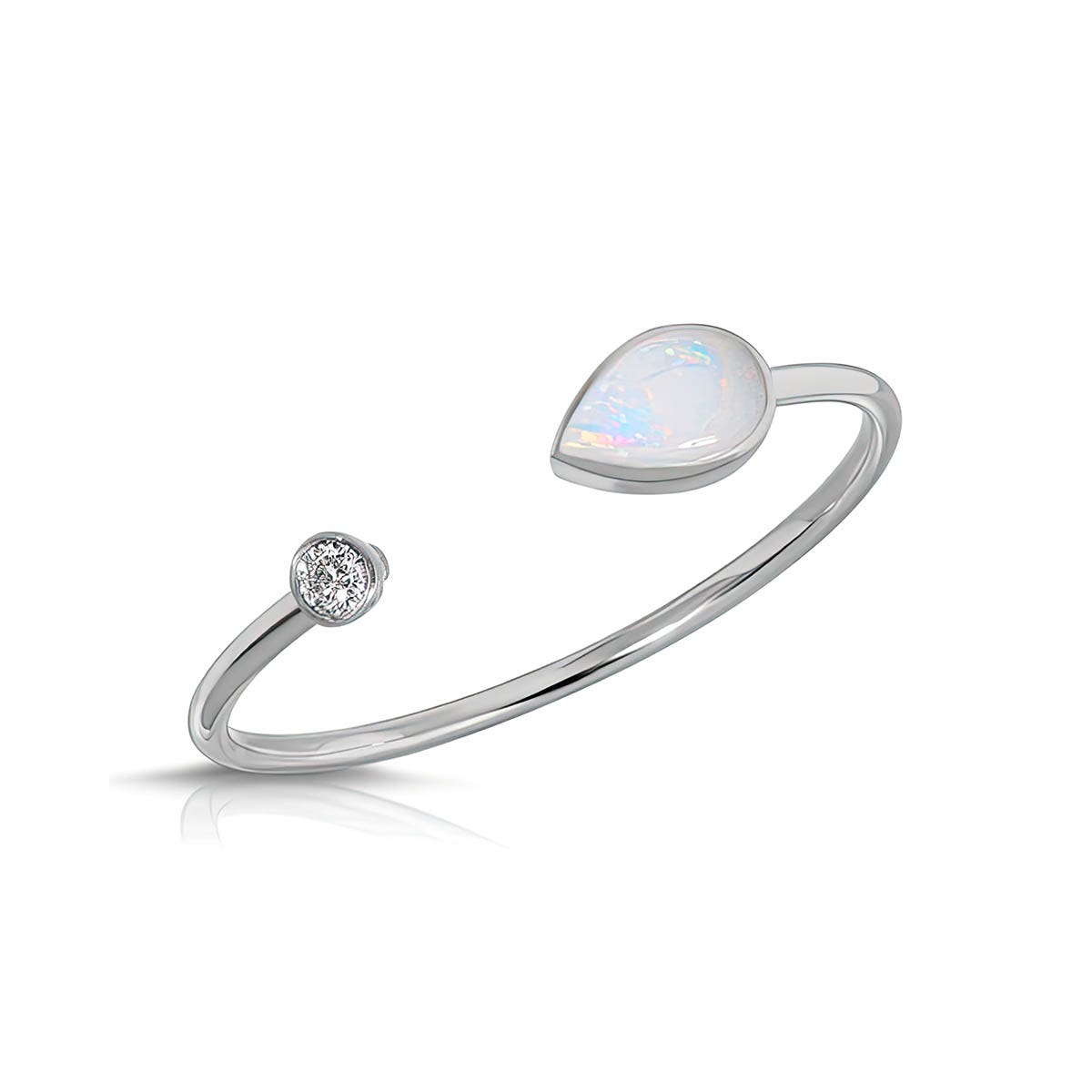 Opal & Diamond Ring handcrafted in 9ct White Gold. Single 0.1 ct genuine opal, single 0.03 ct diamond. Pear cut. Available from sizes H to Z including half sizes. Size: 1 x 18.8 mm (0.04 x 0.74 in). Material: 9ct White Gold. Total metal weight: 0.5 gr. 1 pear cut opal (3 x 5 mm) = 0.1 ct. 1 round brilliant cut diamond (H colour, I3 clarity) = 0.03 ct. Colour: White. Stone cut: Pear cut. Anniversary: 14th Anniversary. Birthstone: October.