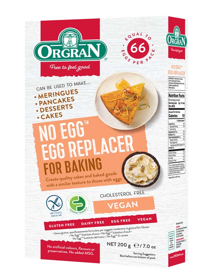 Orgran No Egg is free from cholesterol contains no lactose and no egg. It can be used to make cakes meringues or to make egg free mayonnaise. It is also a handy addition to your cupboards in case you run out of fresh eggs as each packet has the equ