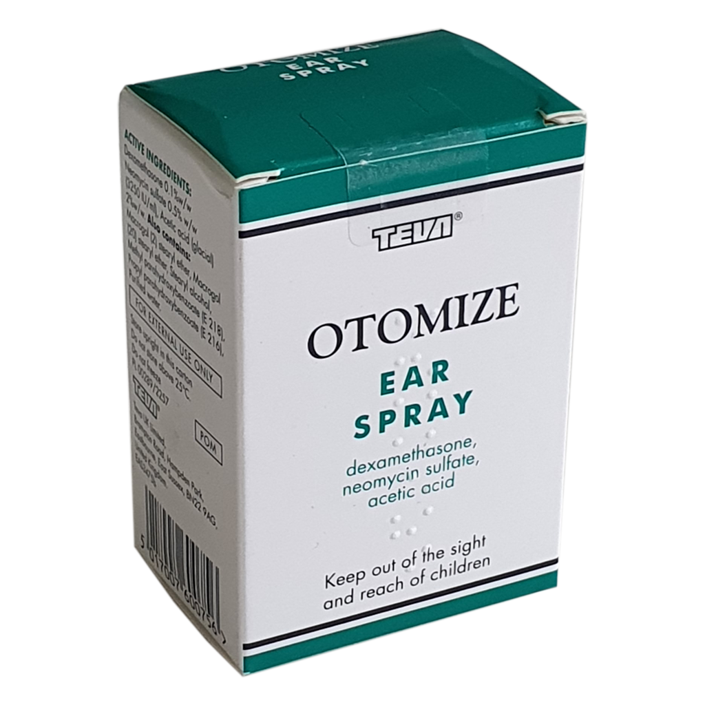 Otomize comes in the form of a spray and is a antibacterial treatment. It contains three active ingredients dexamethasone, neomycin sulphate and acetic acid. Each of these works in a different way to either reduce inflammation or fight the infection at its source.