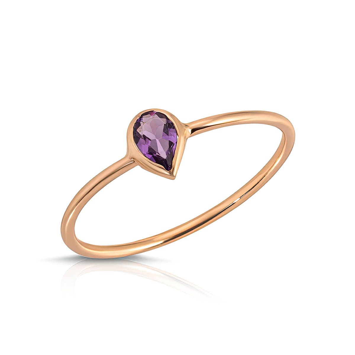 Amethyst Ring handcrafted in 9ct Rose Gold. Single 0.22 ct genuine amethyst. Pear cut. Available from sizes H to Z including half sizes. Size: 1 x 19.8 mm (0.04 x 0.78 in). Material: 9ct Rose Gold. Total metal weight: 0.5 gr. 1 pear cut amethyst (3 x 5 mm) = 0.22 ct. Colour: Purple. Stone cut: Pear cut. Anniversary: 6th Anniversary. Birthstone: February.