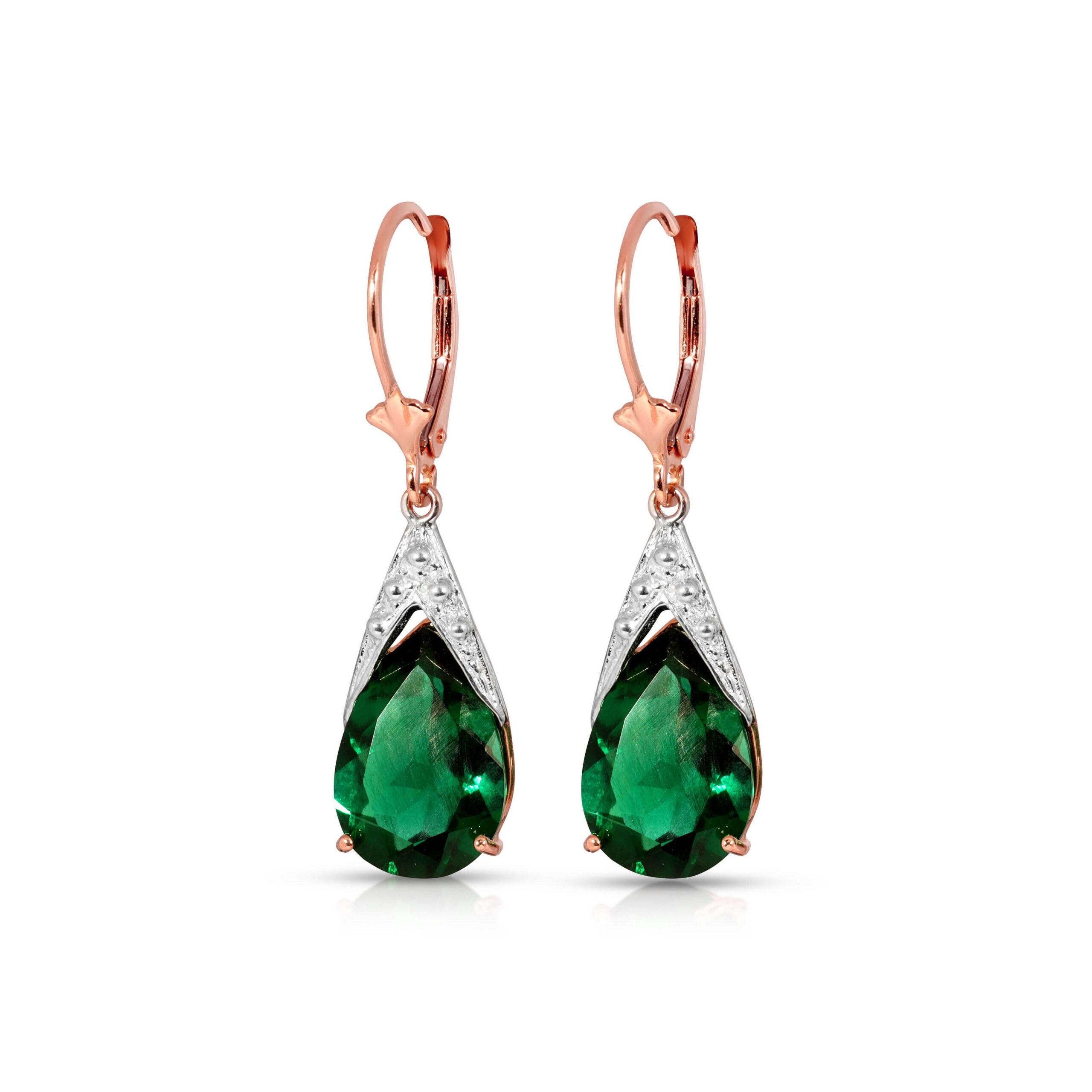 Lab Grown Emerald Leverback Earrings handcrafted in rose gold plated 9ct gold. Two lab grown emeralds, total 7 ct for both earrings combined. Pear cut. Size: 9.1 x 34.8 mm (0.36 x 1.37 in). Material: 9ct Rose Gold. Total metal weight: 2.7 gr. 2 pear cut lab grown emeralds (9 x 13 mm) = 7 ct total for pair. Colour: Green. Stone cut: Pear Cut. Anniversary: 20th Anniversary, 35th Anniversary. Birthstone: May.