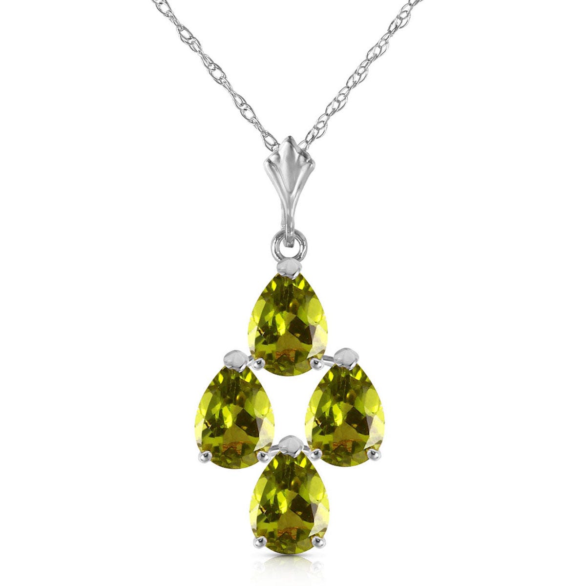 Peridot Pendant Necklace handcrafted in solid white gold. Four genuine peridots, total 2.25 ct. Pear cut. The pendant is suspended from a white gold double link rope chain with spring clasp. Size: 10.4 x 19.3 mm (0.41 x 0.76 in). Material: 9ct White Gold. Total metal weight: 1.84 gr. 4 pear cut peridots (6 x 4 mm) = 2.25 ct total. Colour: Green. Stone cut: Pear Cut. Anniversary: 16th Anniversary. Birthstone: August.