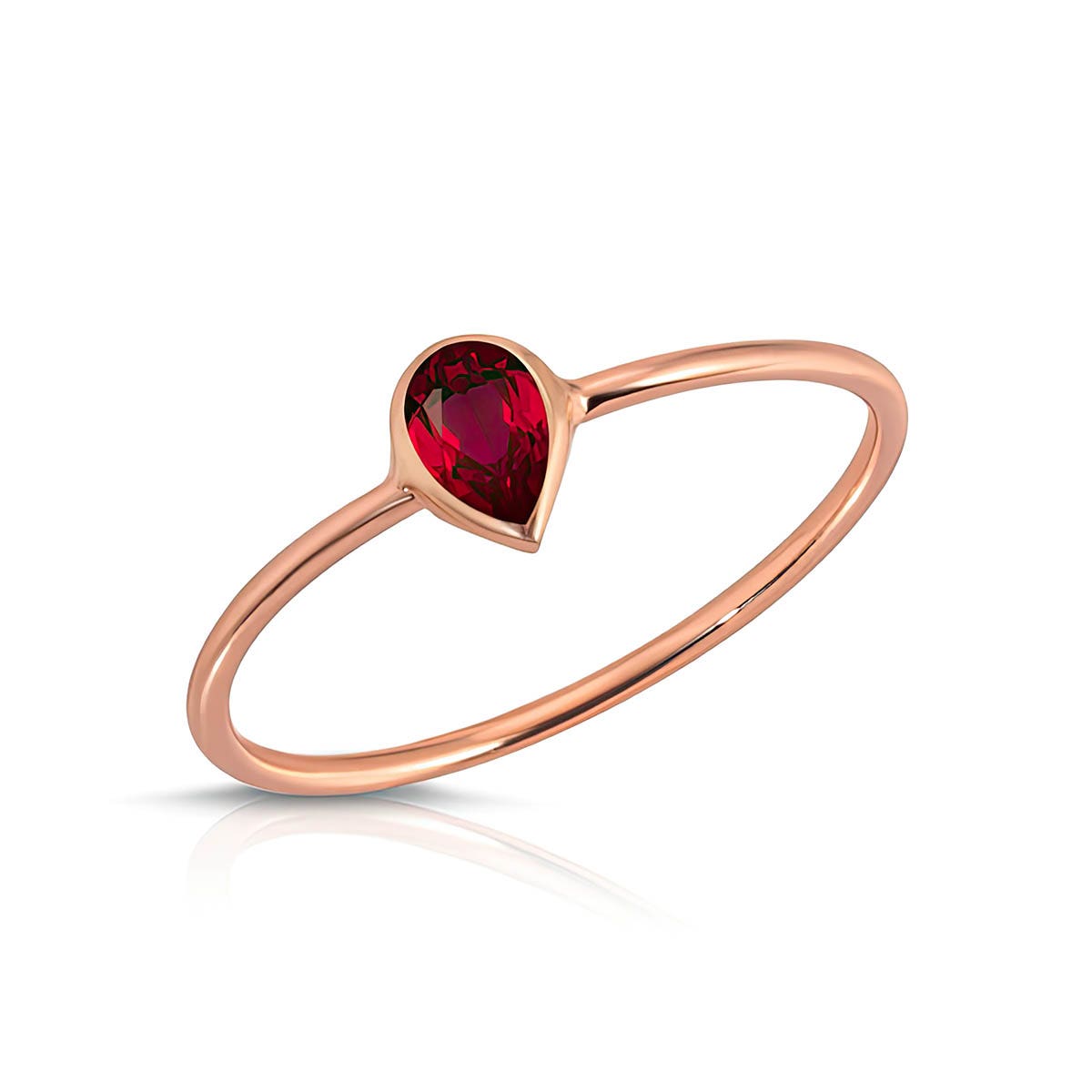 Ruby Ring handcrafted in 9ct Rose Gold. Single 0.3 ct genuine ruby. Pear cut. Available from sizes H to Z including half sizes. Size: 1 x 19.8 mm (0.04 x 0.78 in). Material: 9ct Rose Gold. Total metal weight: 0.5 gr. 1 pear cut ruby (3 x 5 mm) = 0.3 ct. Colour: Red. Stone cut: Pear cut. Anniversary: 15th Anniversary, 40th Anniversary. Birthstone: July.