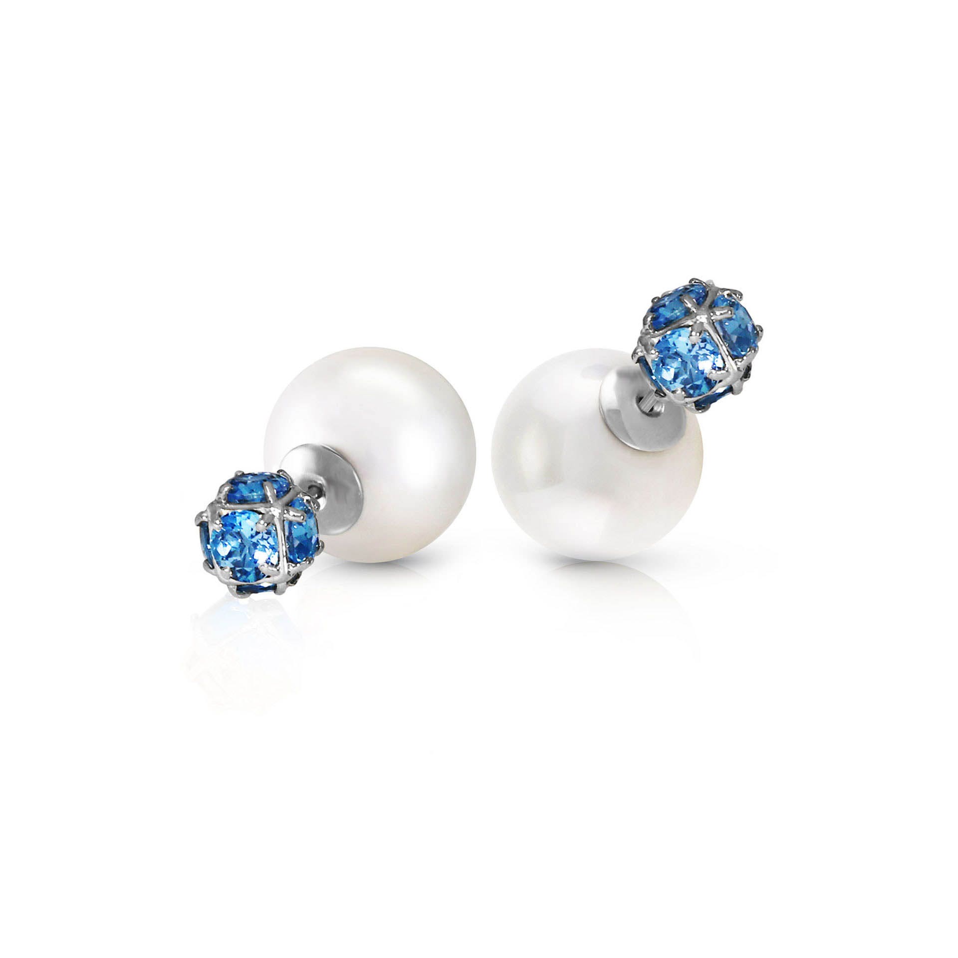 Pearl & Blue Topaz Stud Earrings handcrafted in solid white gold. 14 gemstones, total 69.85 ct for both earrings combined. Post with friction back to fasten. Size: 9.7 x 22.4 mm (0.38 x 0.88 in). Material: 9ct White Gold. Total metal weight: 2.0 gr. 2 pearls (16 x 16 mm) = 62.5 ct total for pair. 12 round cut blue topaz (5 x 5 mm) = 7.35 ct total for pair. Colour: White. Anniversary: 3rd Anniversary, 30th Anniversary. Birthstone: June.