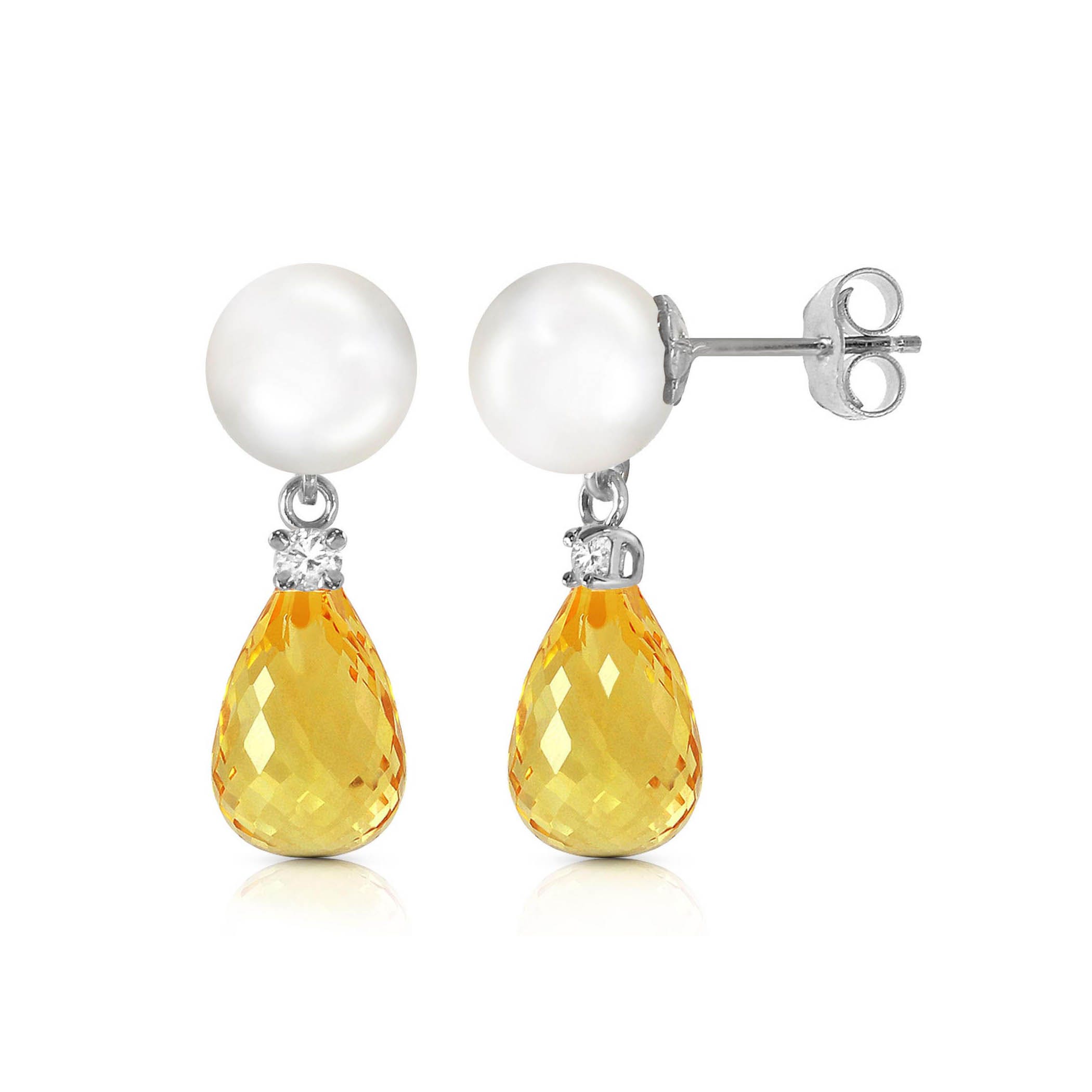 Pearl, Citrine & Diamond Stud Earrings handcrafted in solid white gold. Four gemstones, total 6.5 ct, two diamonds, total 0.1 ct for both earrings combined. Post with friction back to fasten. Size: 6.6 x 21.3 mm (0.26 x 0.84 in). Material: 9ct White Gold. Total metal weight: 2.2 gr. 2 freshwater pearls (7 x 7 mm) = 2 ct total for pair. 2 briolette cut citrines (9 x 6 mm) = 4.5 ct total for pair. 2 round cut diamonds (K colour, SI2 clarity) = 0.1 ct total for pair. Colour: White. Anniversary: 3rd Anniversary, 30th Anniversary. Birthstone: June.