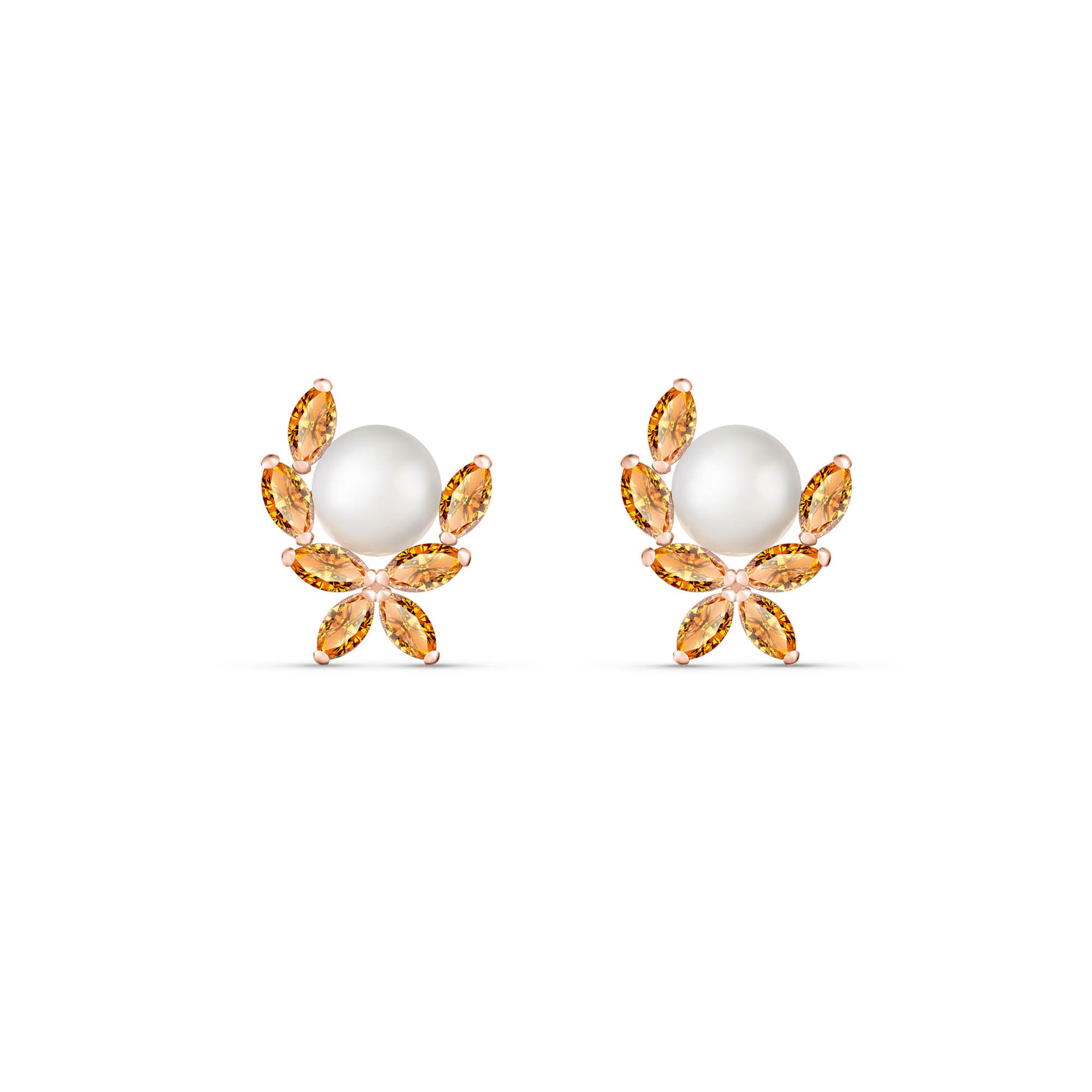 Stud Earrings handcrafted in rose gold plated 9ct gold. 16 gemstones, total 3.25 ct for both earrings combined. Post with friction back to fasten. Size: 10.9 x 14.2 mm (0.43 x 0.56 in). Material: 9ct Rose Gold. Total metal weight: 2.1 gr. 2 freshwater pearls (7 x 7 mm) = 2 ct total for pair. 14 marquise cut citrines (4 x 2 mm) = 1.25 ct total for pair. Colour: White. Anniversary: 3rd Anniversary, 30th Anniversary. Birthstone: June.