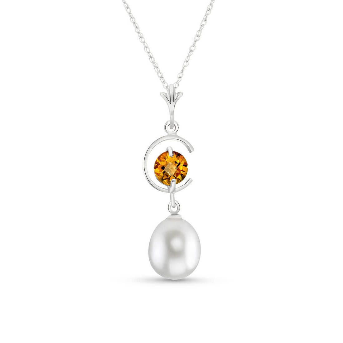 Pearl & Citrine Pendant Necklace handcrafted in solid white gold. Two gemstones, total 4.5 ct. The pendant is suspended from a white gold double link rope chain with spring clasp. Size: 7.9 x 30.5 mm (0.31 x 1.2 in). Material: 9ct White Gold. Total metal weight: 2.14 gr. 1 freshwater pearl (10 x 8 mm) = 4 ct. 1 round cut citrine (5 x 5 mm) = 0.5 ct. Colour: White. Anniversary: 3rd Anniversary, 30th Anniversary. Birthstone: June.