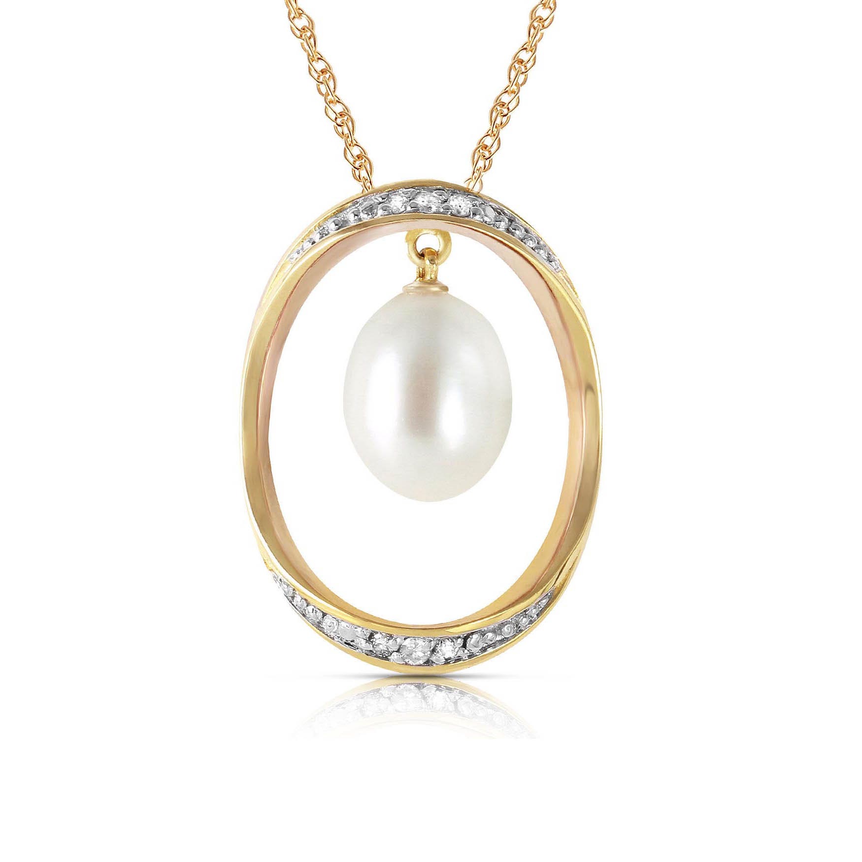 Pearl & Diamond Pendant Necklace handcrafted in solid gold. Single 4 ct genuine pearl, six diamonds, total 0.1 ct. The pendant is suspended from a gold double link rope chain with spring clasp. Size: 19.1 x 25.4 mm (0.75 x 1 in). Material: 9ct Gold. Total metal weight: 4.44 gr. 1 freshwater pearl (10 x 8 mm) = 4 ct. 6 round cut diamonds (G colour, SI1 clarity) = 0.1 ct total. Colour: White. Anniversary: 3rd Anniversary, 30th Anniversary. Birthstone: June.