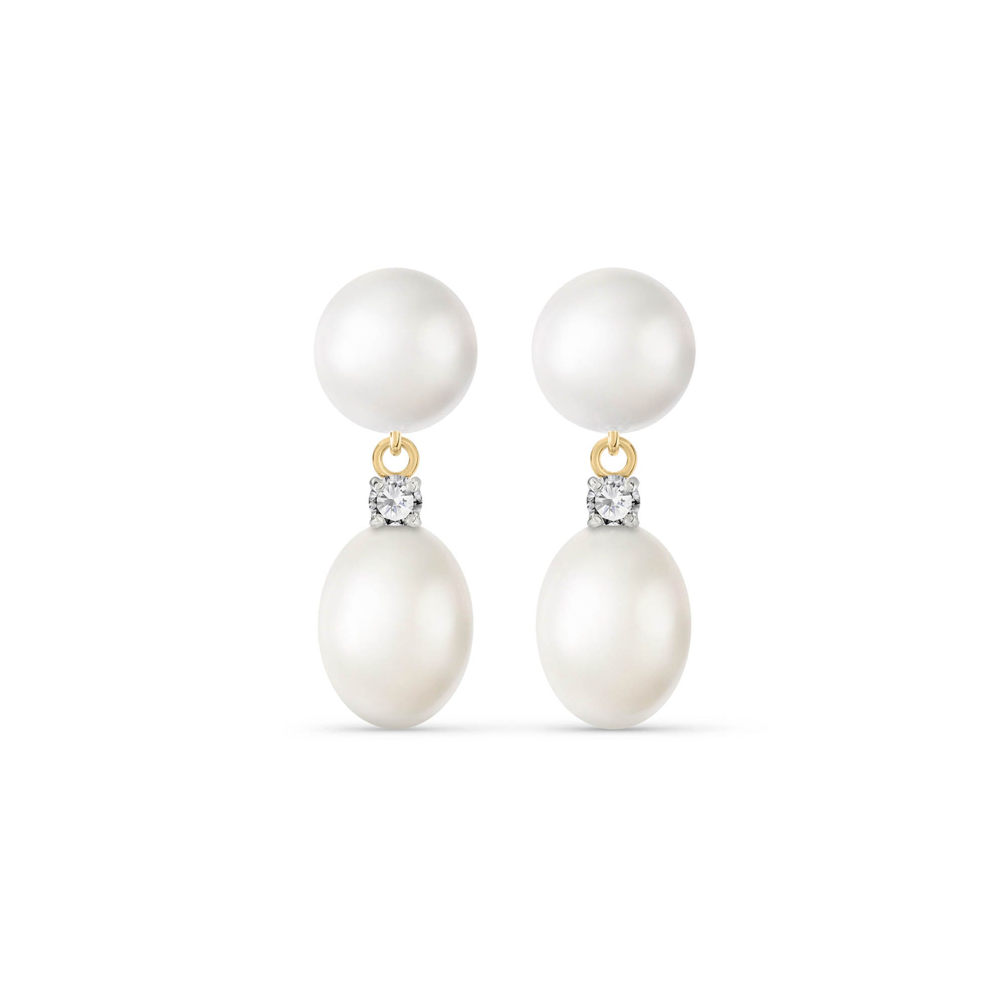 Pearl & Diamond Stud Earrings handcrafted in solid gold. Four gemstones, total 10 ct, two diamonds, total 0.1 ct for both earrings combined. Post with friction back to fasten. Size: 7.6 x 22.4 mm (0.3 x 0.88 in). Material: 9ct Gold. Total metal weight: 2.9 gr. 2 freshwater pearls (7 x 7 mm) = 2 ct total for pair. 2 freshwater pearls (10 x 8 mm) = 8 ct total for pair. 2 round cut diamonds (K colour, SI2 clarity) = 0.1 ct total for pair. Colour: White. Anniversary: 3rd Anniversary, 30th Anniversary. Birthstone: June.