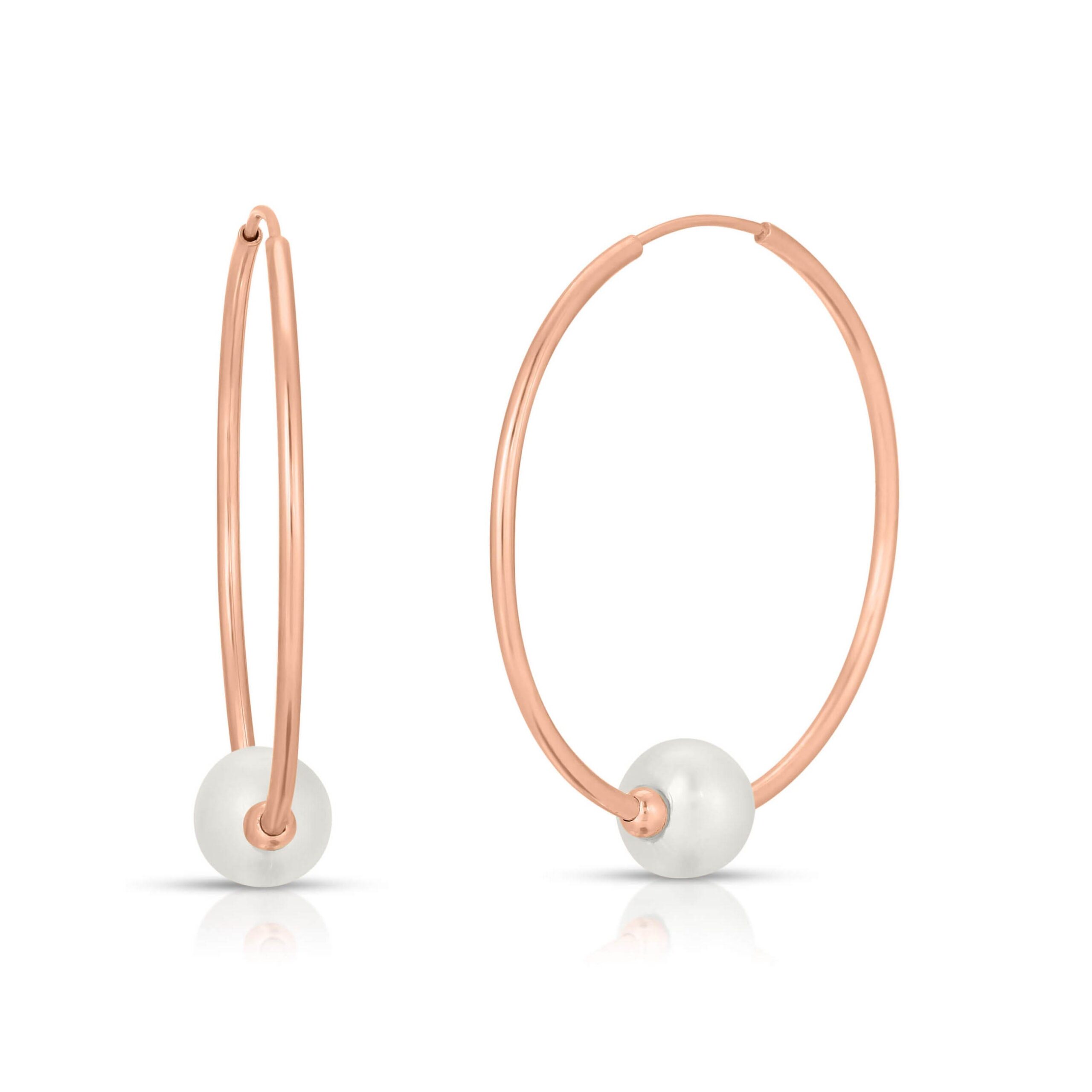 Pearl Hoop Earrings handcrafted in rose gold plated 9ct gold. Two genuine pearls, total 4 ct for both earrings combined. Size: 16.5 x 16.5 mm (0.65 x 0.65 in). Material: 9ct Rose Gold. Total metal weight: 1.2 gr. 2 freshwater pearls (6.5 x 6.5 mm) = 4 ct total for pair. Colour: White. Anniversary: 3rd Anniversary, 30th Anniversary. Birthstone: June.
