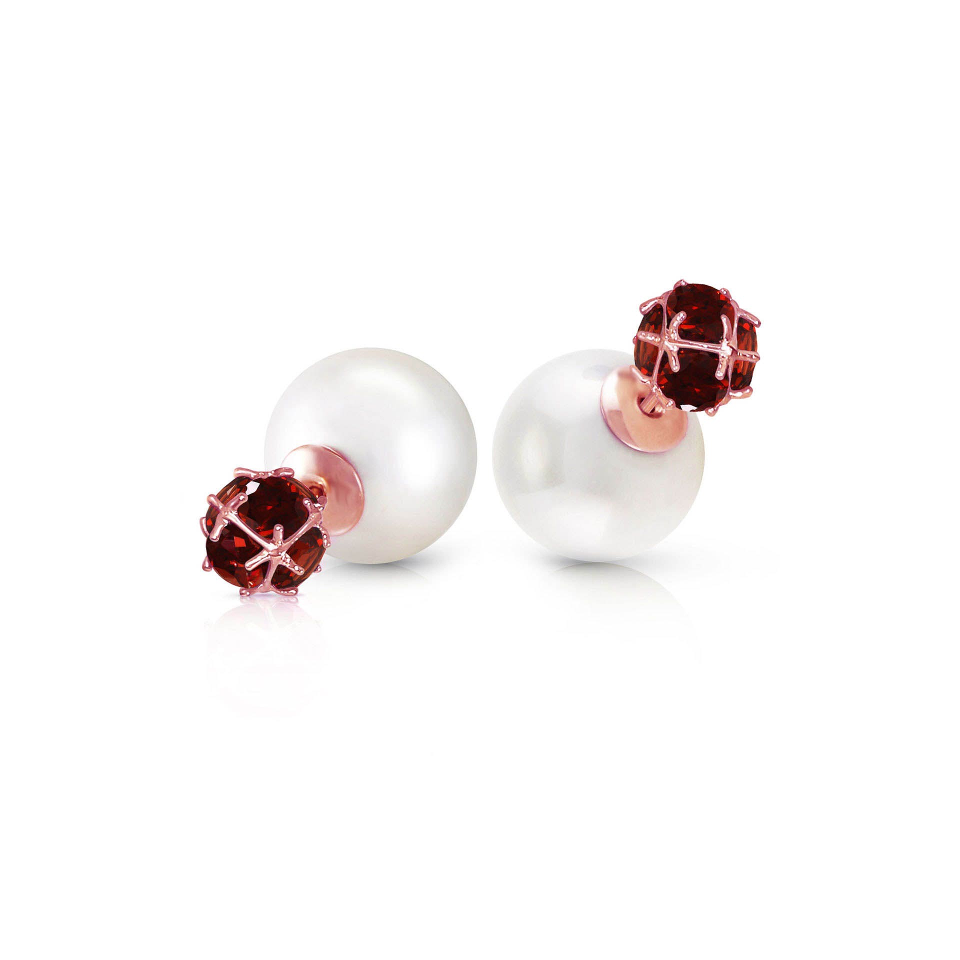 Pearl & Garnet Stud Earrings handcrafted in rose gold plated 9ct gold. 14 gemstones, total 70 ct for both earrings combined. Post with friction back to fasten. Size: 9.7 x 22.4 mm (0.38 x 0.88 in). Material: 9ct Rose Gold. Total metal weight: 1.9 gr. 2 pearls (16 x 16 mm) = 62.5 ct total for pair. 12 round cut garnets (5 x 5 mm) = 7.5 ct total for pair. Colour: White. Anniversary: 3rd Anniversary, 30th Anniversary. Birthstone: June.
