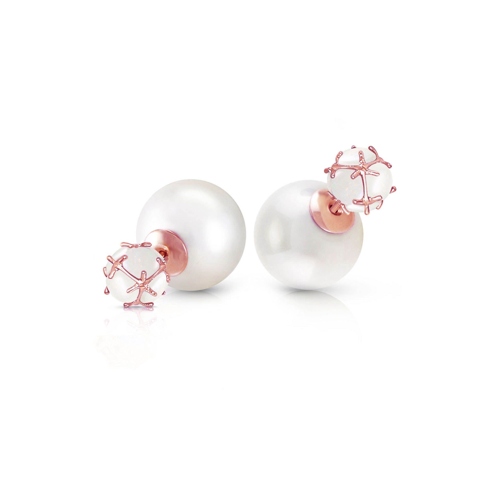 Pearl & Opal Stud Earrings handcrafted in rose gold plated 9ct gold. 14 gemstones, total 66.4 ct for both earrings combined. Post with friction back to fasten. Size: 9.7 x 22.4 mm (0.38 x 0.88 in). Material: 9ct Rose Gold. Total metal weight: 1.9 gr. 2 pearls (16 x 16 mm) = 62.5 ct total for pair. 12 round cut opals (5 x 5 mm) = 3.9 ct total for pair. Colour: White. Anniversary: 3rd Anniversary, 30th Anniversary. Birthstone: June.
