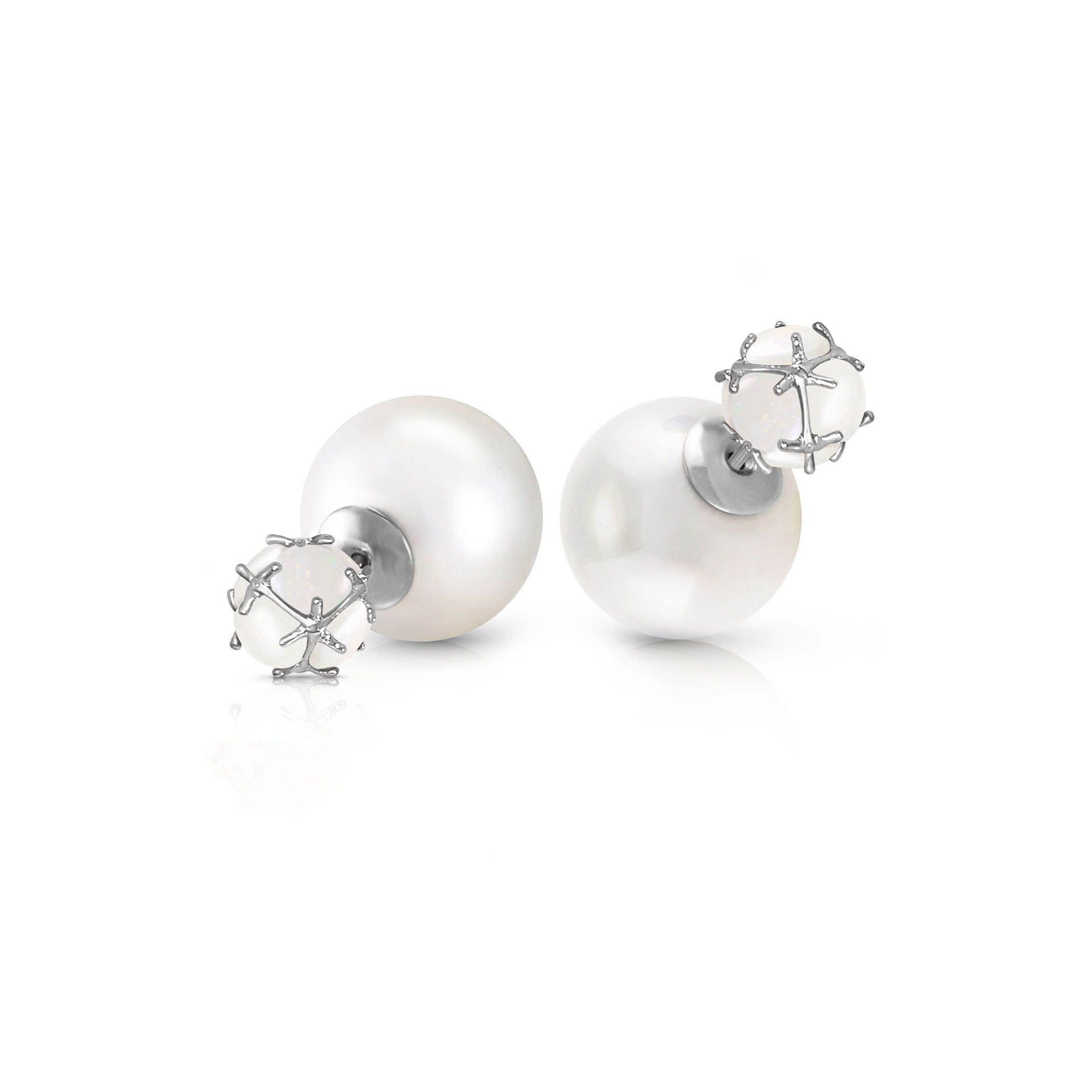 Pearl & Opal Stud Earrings handcrafted in solid white gold. 14 gemstones, total 66.4 ct for both earrings combined. Post with friction back to fasten. Size: 9.7 x 22.4 mm (0.38 x 0.88 in). Material: 9ct White Gold. Total metal weight: 1.9 gr. 2 pearls (16 x 16 mm) = 62.5 ct total for pair. 12 round cut opals (5 x 5 mm) = 3.9 ct total for pair. Colour: White. Anniversary: 3rd Anniversary, 30th Anniversary. Birthstone: June.