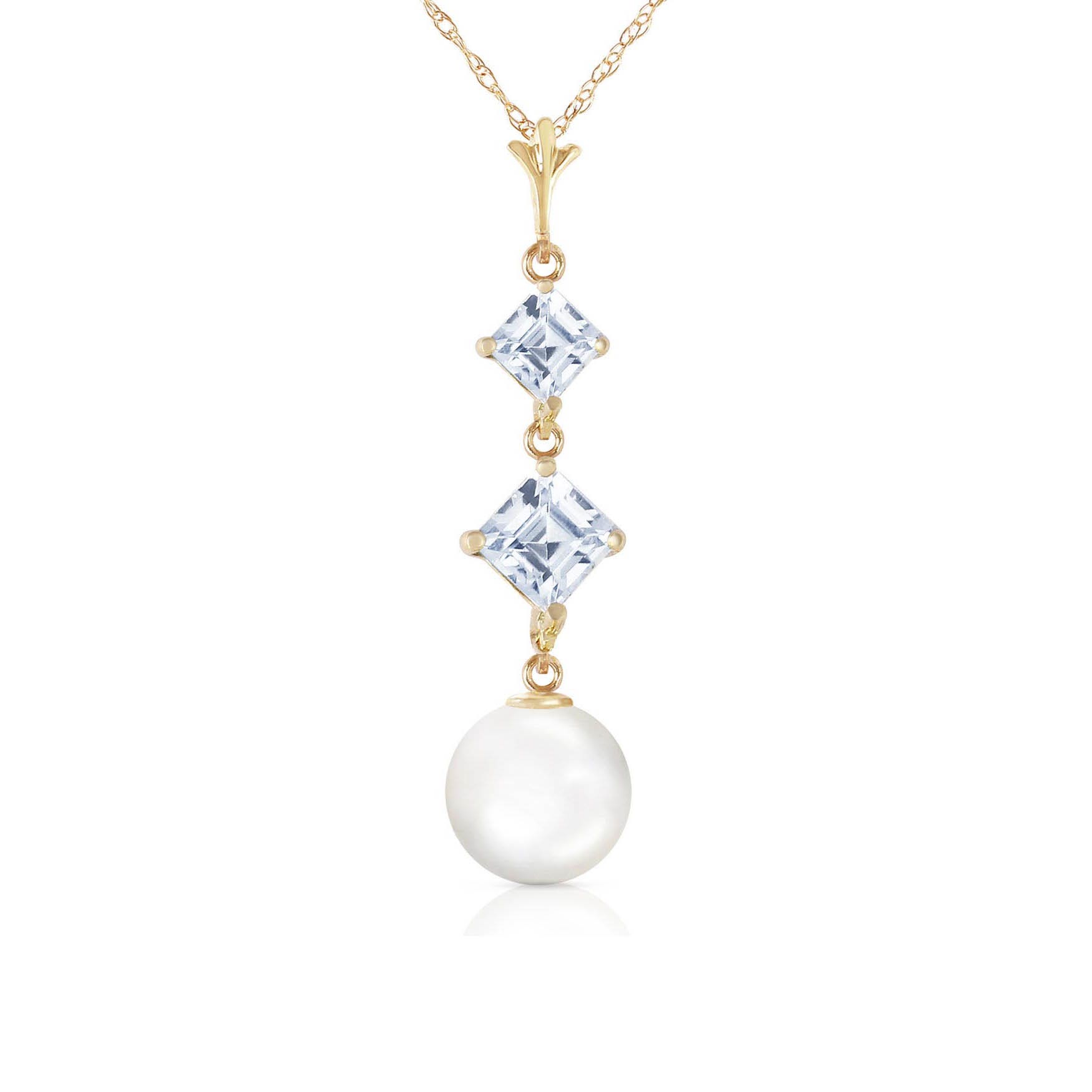 Pearl Pendant Necklace handcrafted in solid gold. Three gemstones, total 3.25 ct. The pendant is suspended from a gold double link rope chain with spring clasp. Size: 7.1 x 32.3 mm (0.28 x 1.27 in). Material: 9ct Gold. Total metal weight: 1.84 gr. 1 freshwater pearl (6.5 x 6.5 mm) = 2 ct. 1 square cut aquamarine (5 x 5 mm) = 0.75 ct. 1 square cut aquamarine (4 x 4 mm) = 0.5 ct. Colour: White. Anniversary: 3rd Anniversary, 30th Anniversary. Birthstone: June.