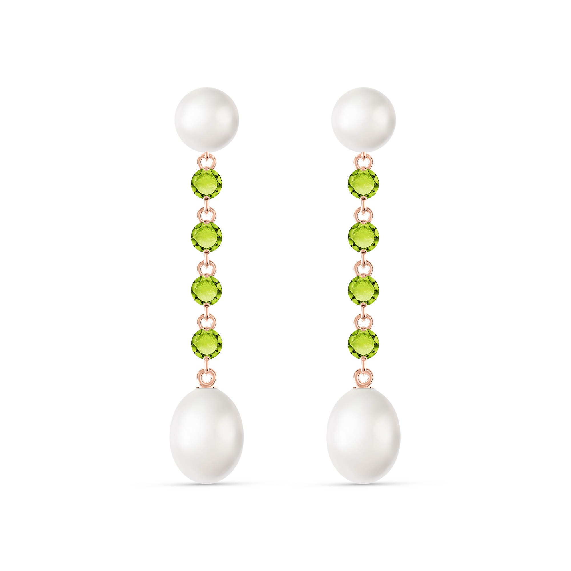 Pearl & Peridot Chandelierdrop Earrings handcrafted in rose gold plated 9ct gold. Twelve gemstones, total 11 ct for both earrings combined. Size: 7.6 x 45.2 mm (0.3 x 1.78 in). Material: 9ct Rose Gold. Total metal weight: 3.6 gr. 2 freshwater pearls (7 x 7 mm) = 2 ct total for pair. 8 round cut peridots (3 x 3 mm) = 1 ct total for pair. 2 freshwater pearls (10 x 8 mm) = 8 ct total for pair. Colour: White. Anniversary: 3rd Anniversary, 30th Anniversary. Birthstone: June.