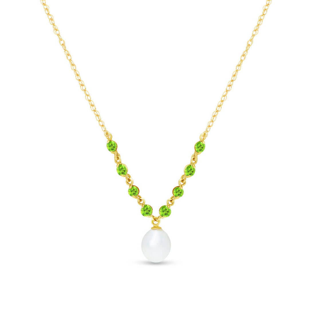 Pearl & Peridot Pendant Necklace handcrafted in solid gold. Nine gemstones, total 5 ct. The pendant is suspended from a gold double link rope chain with spring clasp. Size: 14 mm (0.55 in). Material: 9ct Gold. Total metal weight: 2.54 gr. 1 freshwater pearl (10 x 8 mm) = 4 ct. 8 round cut peridots (3 x 3 mm) = 1 ct total. Colour: White. Anniversary: 3rd Anniversary, 30th Anniversary. Birthstone: June.