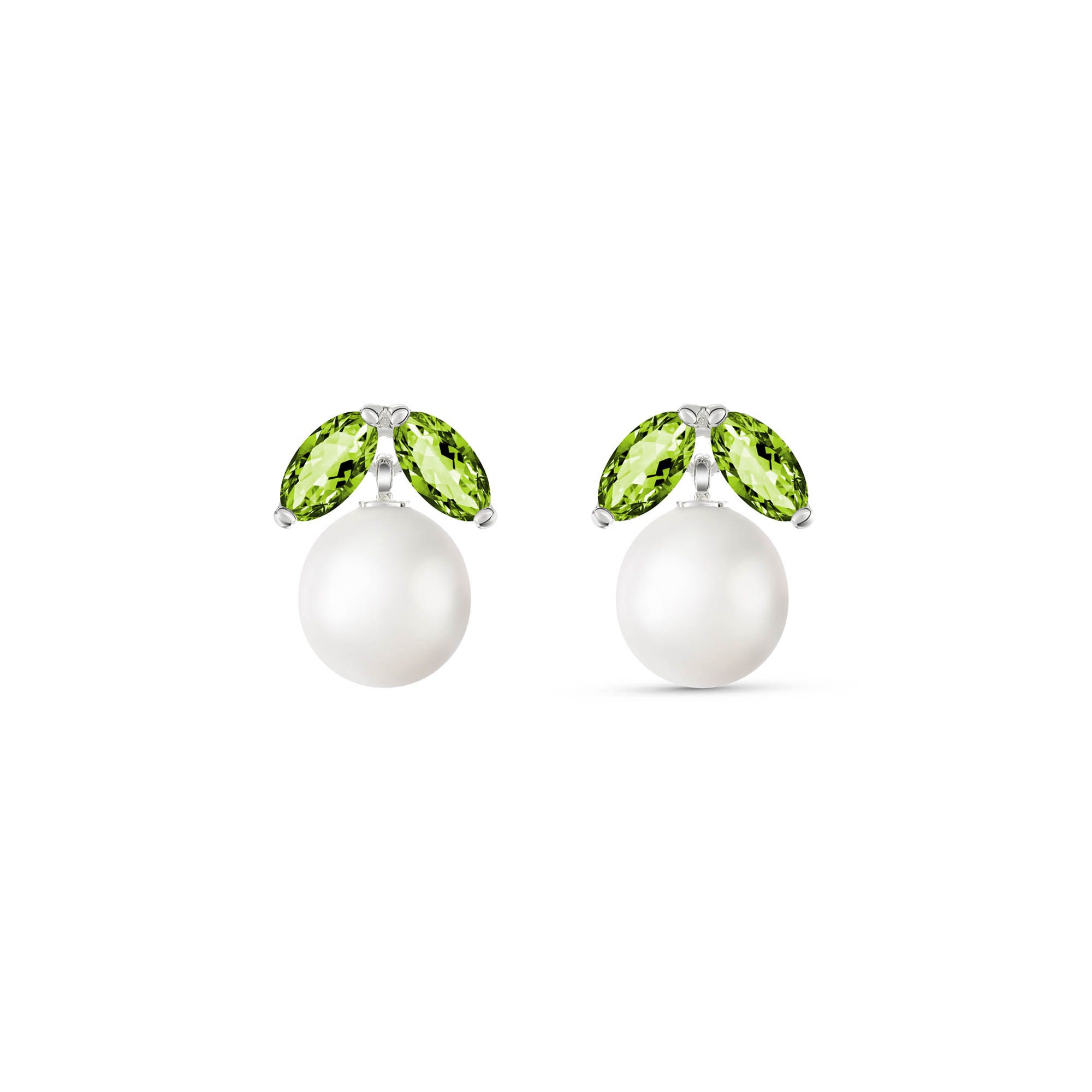 Pearl & Peridot Stud Earrings handcrafted in solid white gold. Six gemstones, total 4.4 ct for both earrings combined. Post with friction back to fasten. Size: 7.6 x 10.7 mm (0.3 x 0.42 in). Material: 9ct White Gold. Total metal weight: 1.3 gr. 2 freshwater pearls (7 x 7 mm) = 4 ct total for pair. 4 marquise cut peridots (4 x 2 mm) = 0.4 ct total for pair. Colour: White. Anniversary: 3rd Anniversary, 30th Anniversary. Birthstone: June.