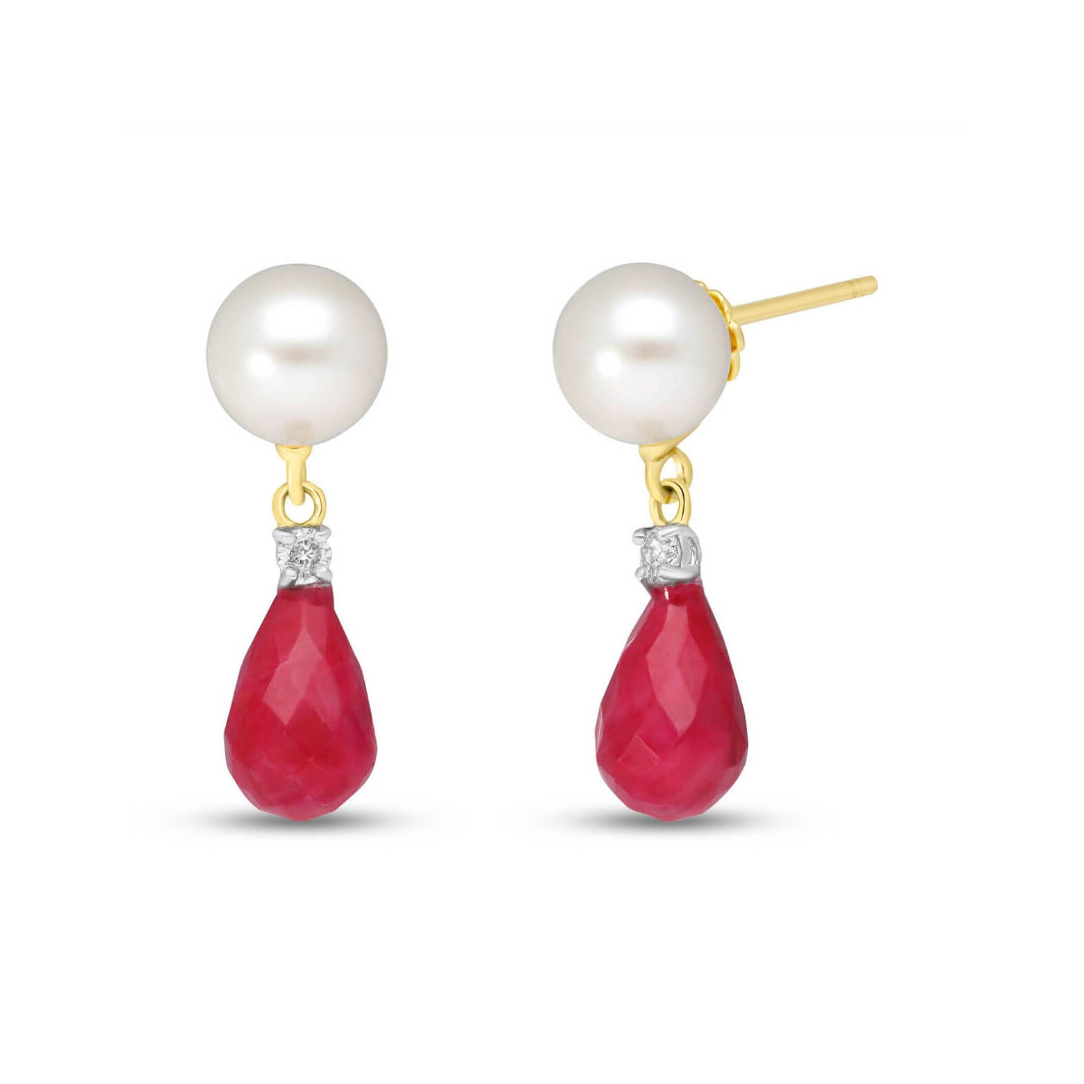Pearl, Ruby & Diamond Chandelier Earrings handcrafted in solid gold. Four gemstones, total 8.6 ct, two diamonds, total 0.1 ct for both earrings combined. Size: 6.6 x 21.3 mm (0.26 x 0.84 in). Material: 9ct Gold. Total metal weight: 2.6 gr. 2 freshwater pearls (7 x 7 mm) = 2 ct total for pair. 2 briolette cut rubies (9 x 6 mm, VS1 clarity) = 6.6 ct total for pair. 2 round cut diamonds (K colour, SI2 clarity) = 0.1 ct total for pair. Colour: White. Anniversary: 3rd Anniversary, 30th Anniversary. Birthstone: June.