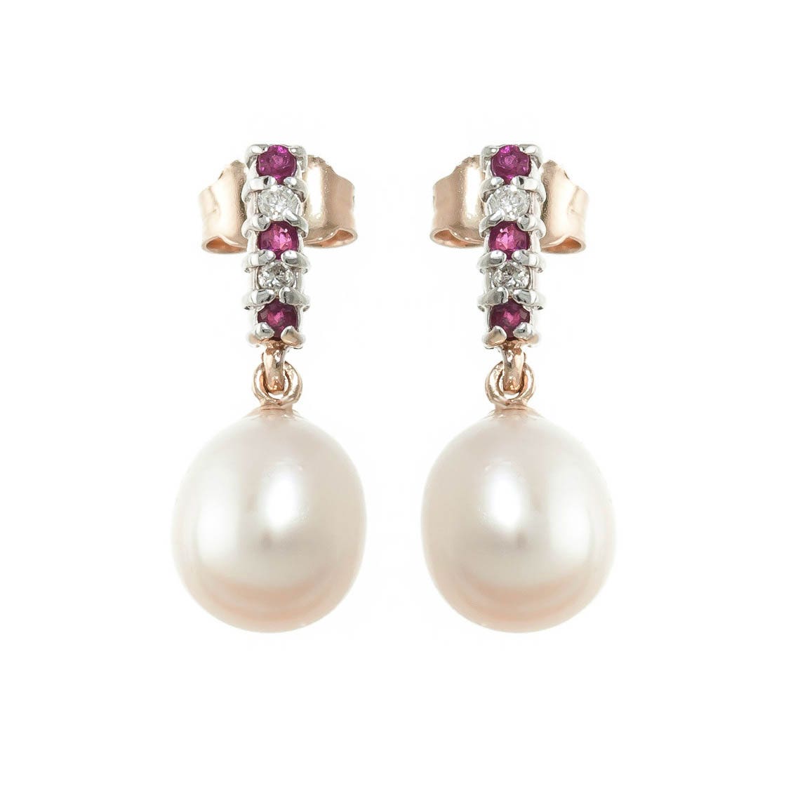 Pearl, Ruby & Diamond Stud Earrings handcrafted in rose gold plated 9ct gold. Eight gemstones, total 8.24 ct, four diamonds, total 0.06 ct for both earrings combined. Post with friction back to fasten. Size: 7.6 x 22.1 mm (0.3 x 0.87 in). Material: 9ct Rose Gold. Total metal weight: 1.1 gr. 2 freshwater pearls (10 x 8 mm) = 8 ct total for pair. 6 round cut rubies (VS1 clarity) = 0.24 ct total for pair. 4 round cut diamonds (K colour, SI2 clarity) = 0.06 ct total for pair. Colour: White. Anniversary: 3rd Anniversary, 30th Anniversary. Birthstone: June.