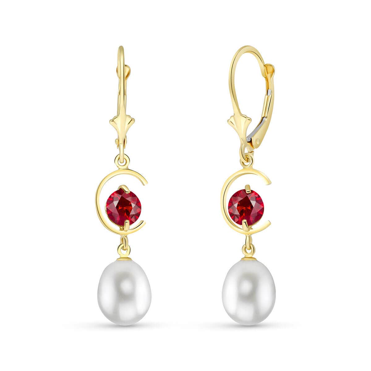 Pearl & Ruby Leverback Earrings handcrafted in solid gold. Four gemstones, total 9 ct for both earrings combined. Size: 7.9 x 39.6 mm (0.31 x 1.56 in). Material: 9ct Gold. Total metal weight: 3.0 gr. 2 freshwater pearls (10 x 8 mm) = 8 ct total for pair. 2 round cut rubies (5 x 5 mm, VS1 clarity) = 1 ct total for pair. Colour: White. Anniversary: 3rd Anniversary, 30th Anniversary. Birthstone: June.