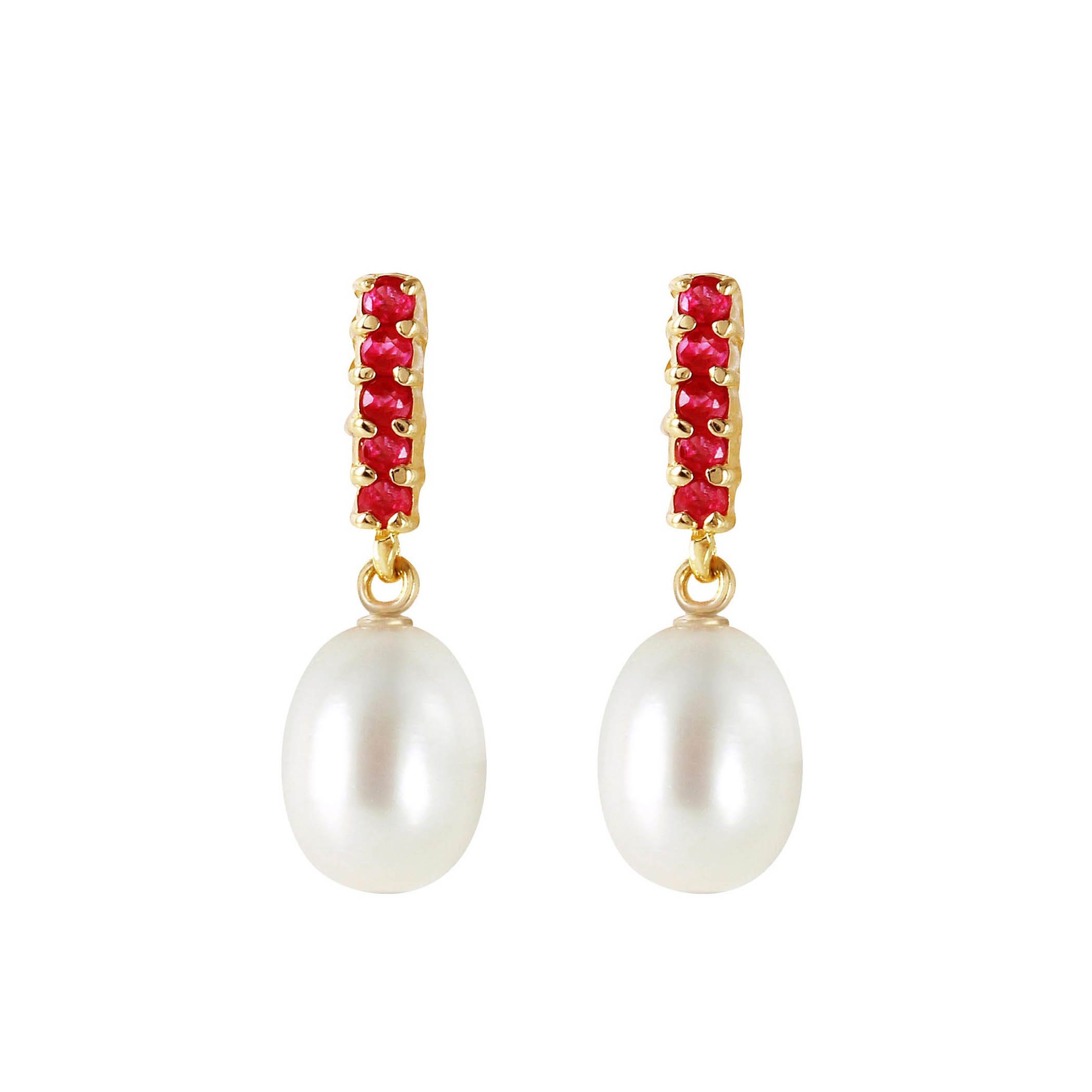 Pearl & Ruby Stud Earrings handcrafted in solid gold. Twelve gemstones, total 8.4 ct for both earrings combined. Post with friction back to fasten. Size: 7.6 x 22.1 mm (0.3 x 0.87 in). Material: 9ct Gold. Total metal weight: 1.6 gr. 2 freshwater pearls (10 x 8 mm) = 8 ct total for pair. 10 round cut rubies (1.5 x 1.5 mm, VS1 clarity) = 0.4 ct total for pair. Colour: White. Anniversary: 3rd Anniversary, 30th Anniversary. Birthstone: June.