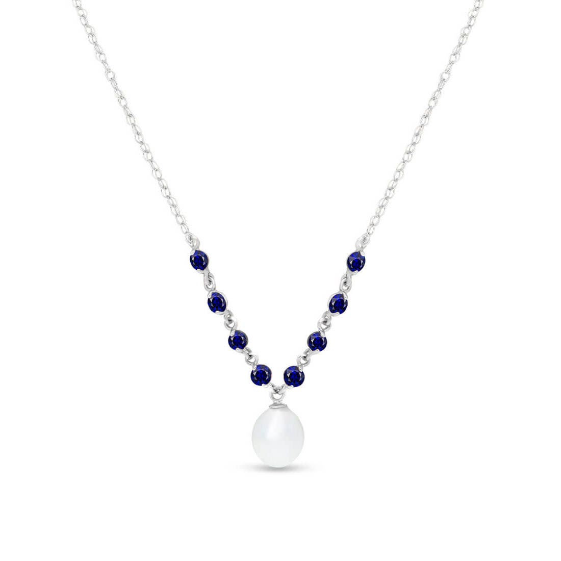 Pearl & Sapphire Pendant Necklace handcrafted in solid white gold. Nine gemstones, total 5 ct. The pendant hangs from a white gold double link rope chain with spring clasp. Size: 14 mm (0.55 in). Material: 9ct White Gold. Total metal weight: 2.54 gr. 1 freshwater pearl (10 x 8 mm) = 4 ct. 8 round cut sapphires (3 x 3 mm) = 1 ct total. Colour: White. Anniversary: 3rd Anniversary, 30th Anniversary. Birthstone: June.