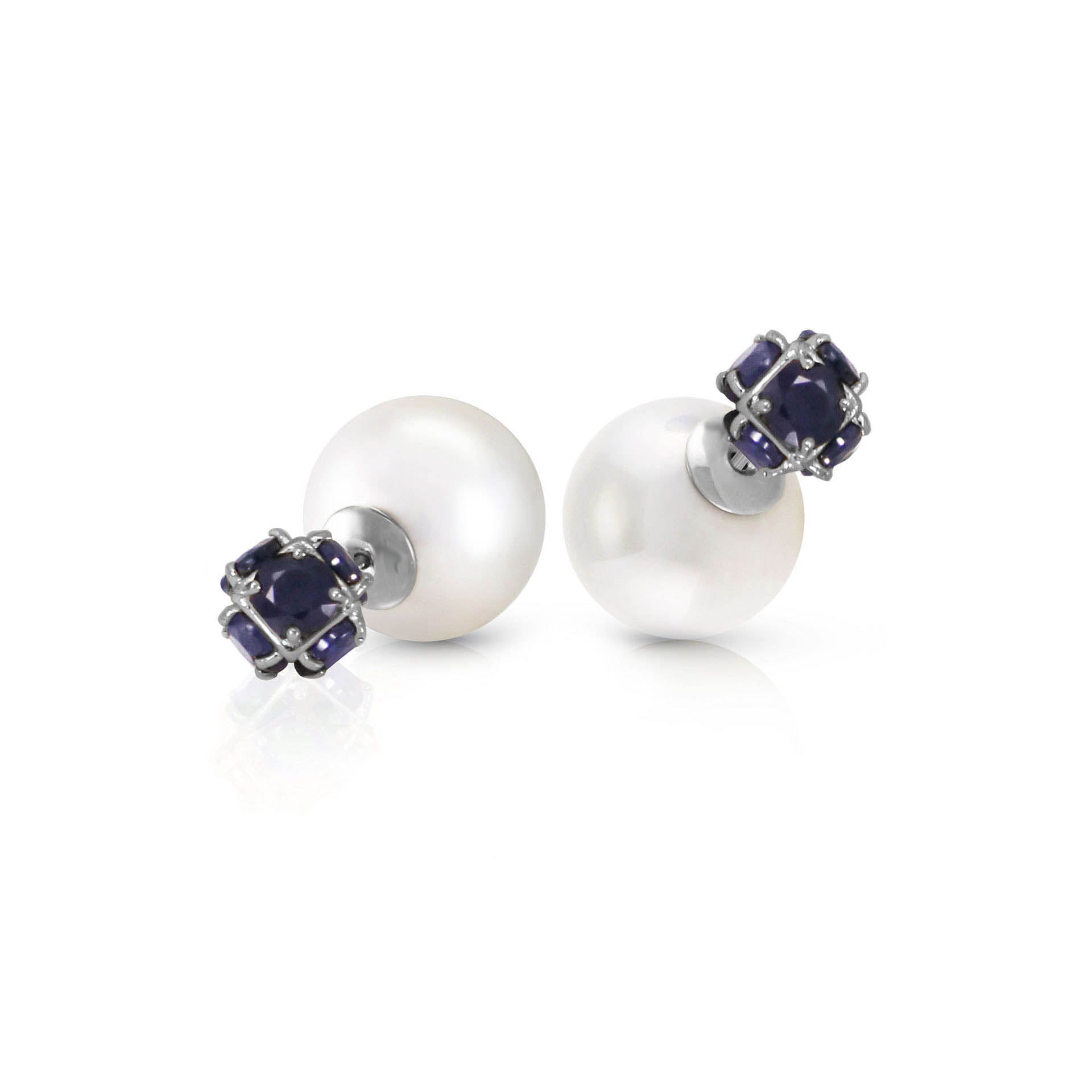 Pearl & Sapphire Stud Earrings handcrafted in solid white gold. 14 gemstones, total 71.1 ct for both earrings combined. Post with friction back to fasten. Size: 9.7 x 22.4 mm (0.38 x 0.88 in). Material: 9ct White Gold. Total metal weight: 1.9 gr. 2 pearls (16 x 16 mm) = 62.5 ct total for pair. 12 round cut sapphires (5 x 5 mm) = 8.6 ct total for pair. Colour: White. Anniversary: 3rd Anniversary, 30th Anniversary. Birthstone: June.