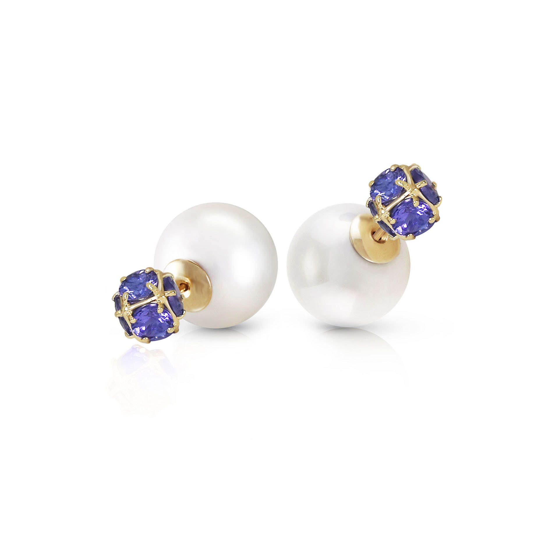 Pearl & Tanzanite Stud Earrings handcrafted in solid gold. 14 gemstones, total 69.2 ct for both earrings combined. Post with friction back to fasten. Size: 9.7 x 22.4 mm (0.38 x 0.88 in). Material: 9ct Gold. Total metal weight: 1.9 gr. 2 pearls (16 x 16 mm) = 62.5 ct total for pair. 12 round cut tanzanites (5 x 5 mm) = 6.7 ct total for pair. Colour: White. Anniversary: 3rd Anniversary, 30th Anniversary. Birthstone: June.