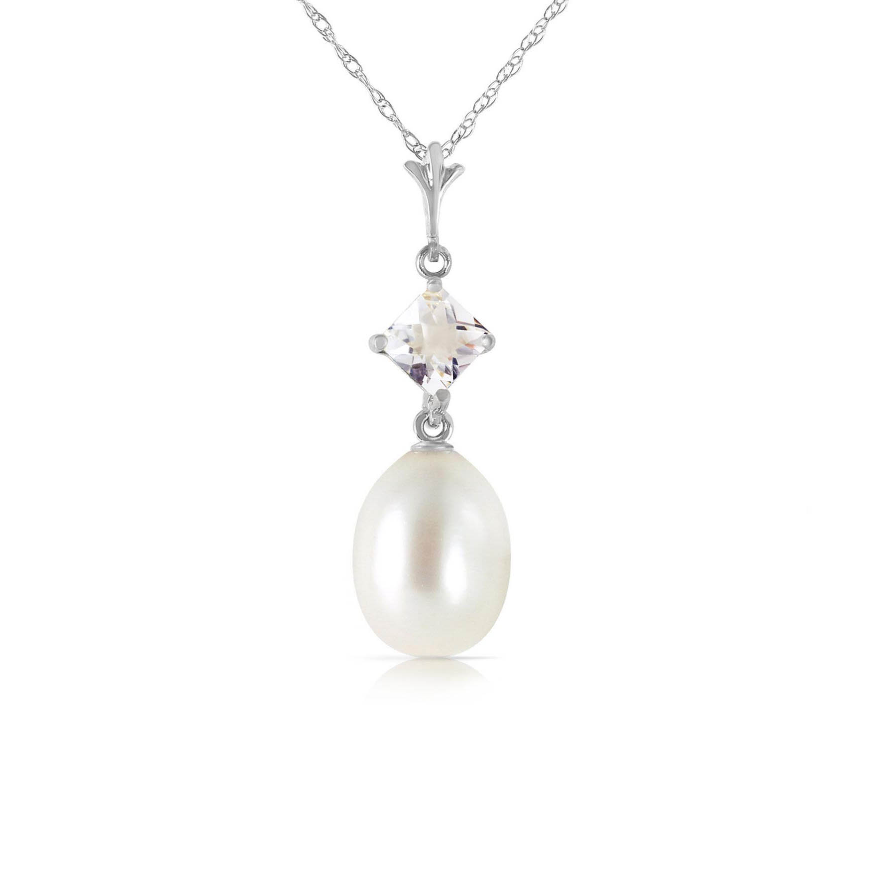 Pearl & White Topaz Pendant Necklace handcrafted in solid white gold. Two gemstones, total 4.5 ct. The pendant hangs from a white gold double link rope chain with spring clasp. Size: 7.9 x 26.2 mm (0.31 x 1.03 in). Material: 9ct White Gold. Total metal weight: 1.84 gr. 1 freshwater pearl (10 x 8 mm) = 4 ct. 1 square cut white topaz (4 x 4 mm) = 0.5 ct. Colour: White. Anniversary: 3rd Anniversary, 30th Anniversary. Birthstone: June.