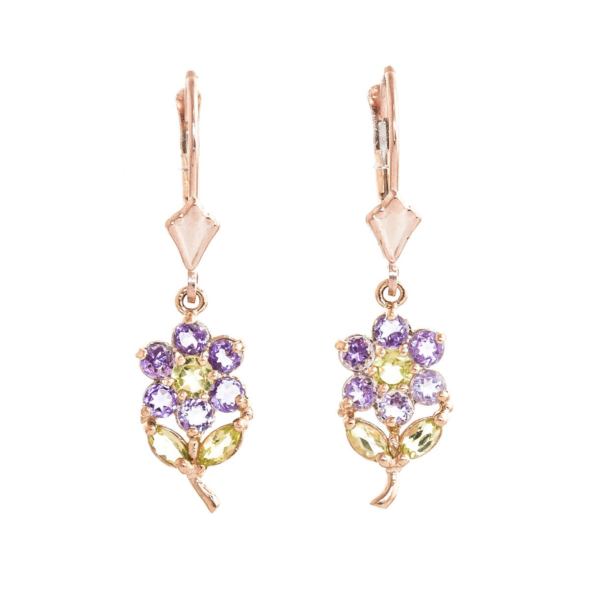 Peridot & Amethyst Leverback Flower Earrings handcrafted in rose gold plated 9ct gold. 18 gemstones, total 2.12 ct for both earrings combined. Round cut. Size: 8.1 x 30.5 mm (0.32 x 1.2 in). Material: 9ct Rose Gold. Total metal weight: 2.2 gr. 2 round cut peridots (3 x 3 mm) = 0.32 ct total for pair. 4 marquise cut peridots (4 x 2 mm) = 0.3 ct total for pair. 12 round cut amethysts (2.5 x 2.5 mm) = 1.5 ct total for pair. Colour: Green. Stone cut: Round Cut. Anniversary: 16th Anniversary. Birthstone: August.