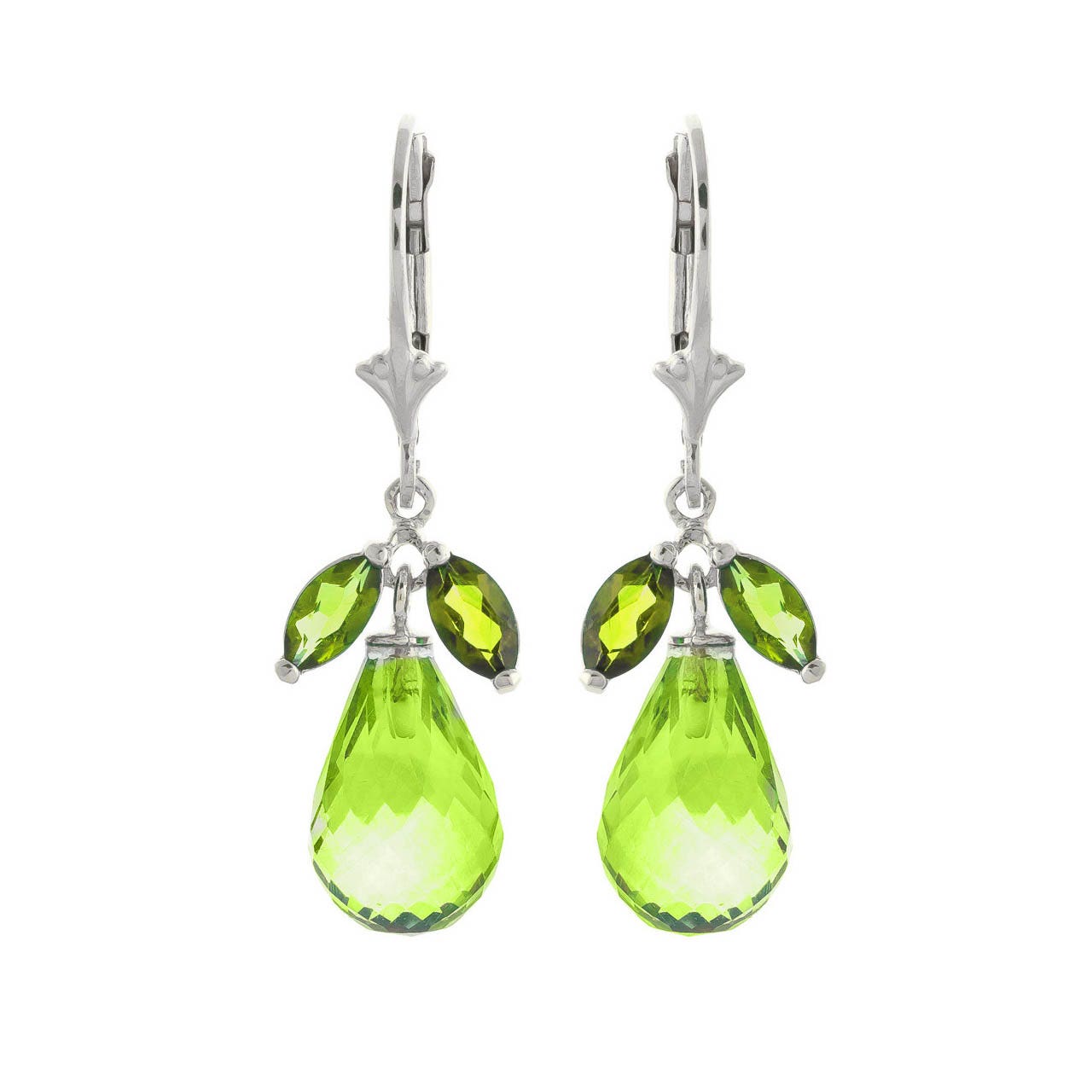 Peridot & Blue Topaz Leverback Earrings handcrafted in solid white gold. Six gemstones, total 14.4 ct for both earrings combined. Marquise cut. Size: 10.2 x 33 mm (0.4 x 1.3 in). Material: 9ct White Gold. Total metal weight: 3.9 gr. 4 marquise cut peridots (6 x 3 mm) = 1 ct total for pair. 2 briolette cut blue topaz (12 x 8 mm) = 13.4 ct total for pair. Colour: Green. Stone cut: Marquise Cut. Anniversary: 16th Anniversary. Birthstone: August.