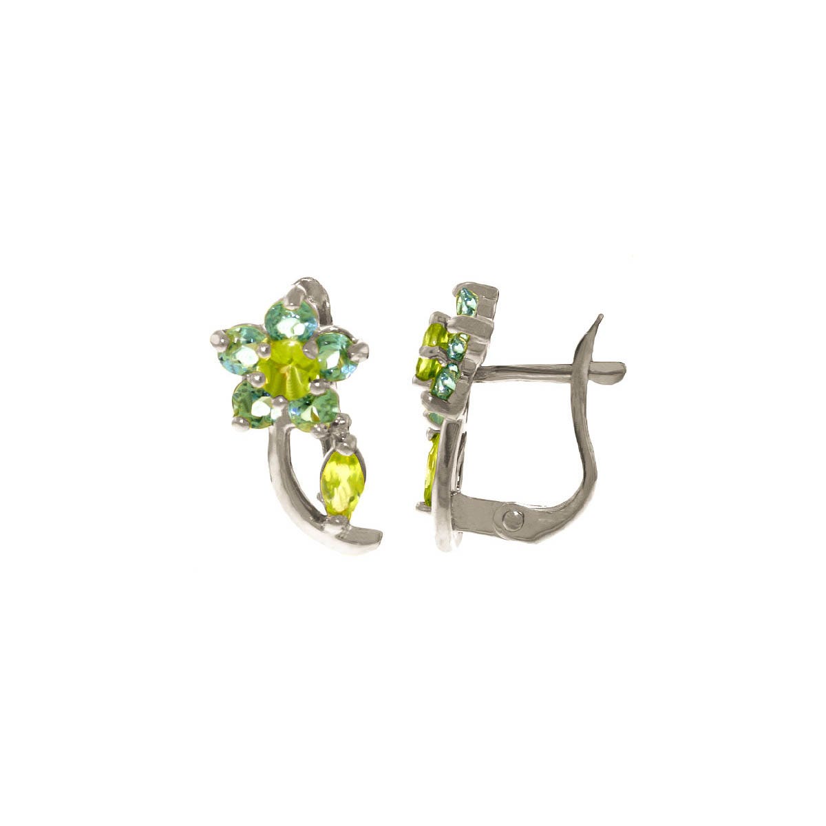 Peridot & Blue Topaz Stud Flower Earrings handcrafted in solid white gold. 14 gemstones, total 1.72 ct for both earrings combined. Round cut. Post with friction back to fasten. Size: 7.9 x 14.7 mm (0.31 x 0.58 in). Material: 9ct White Gold. Total metal weight: 1.7 gr. 2 round cut peridots (3 x 3 mm) = 0.32 ct total for pair. 2 marquise cut peridots (4 x 2 mm) = 0.15 ct total for pair. 10 round cut blue topaz (2.5 x 2.5 mm) = 1.25 ct total for pair. Colour: Green. Stone cut: Round Cut. Anniversary: 16th Anniversary. Birthstone: August.