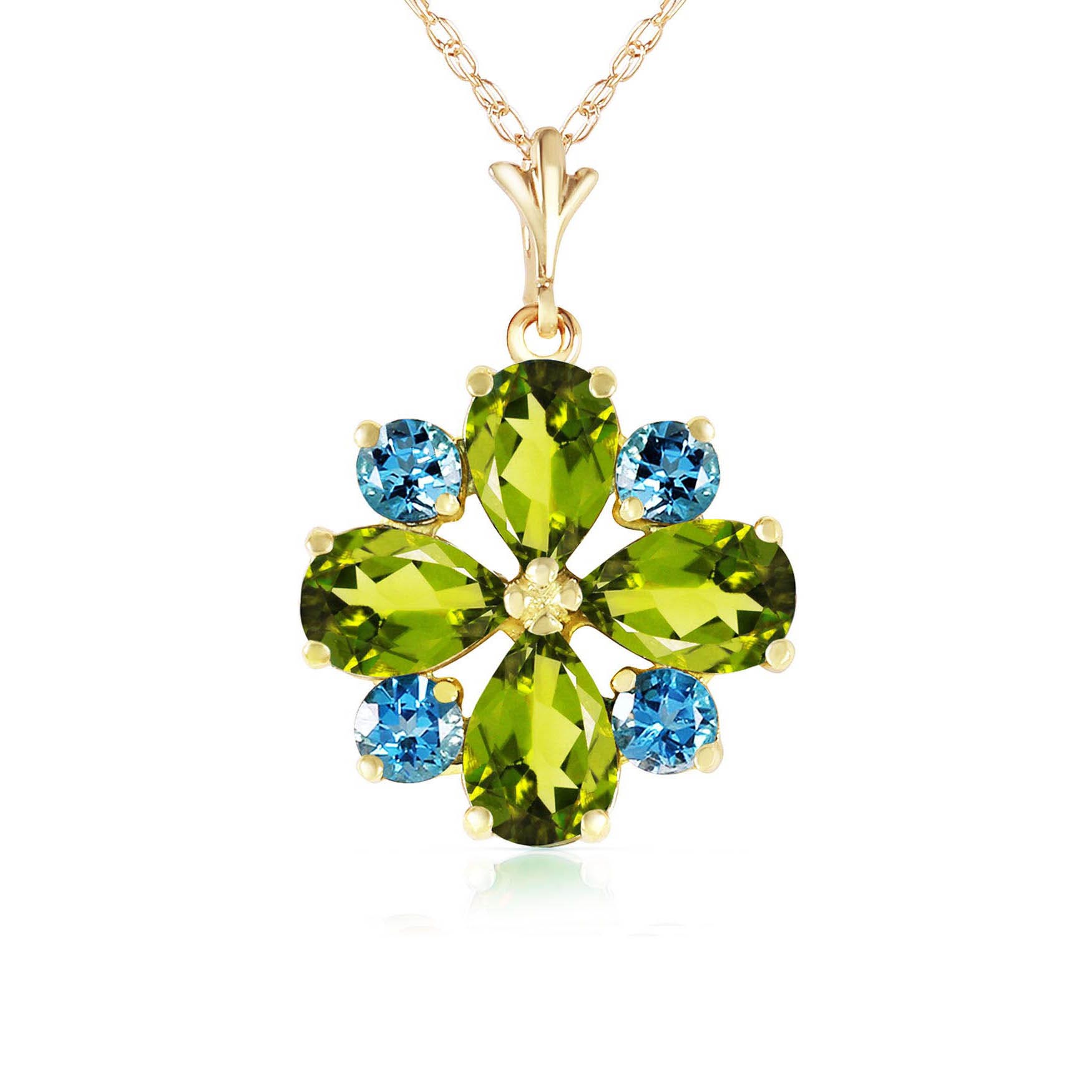Peridot & Blue Topaz Pendant Necklace handcrafted in solid gold. Eight gemstones, total 2.43 ct. Pear cut. The pendant hangs from a gold double link rope chain with spring clasp. Size: 14 x 21.6 mm (0.55 x 0.85 in). Material: 9ct Gold. Total metal weight: 2.24 gr. 4 pear cut peridots (6 x 4 mm) = 1.63 ct total. 4 round cut blue topaz (3 x 3 mm) = 0.8 ct total. Colour: Green. Stone cut: Pear Cut. Anniversary: 16th Anniversary. Birthstone: August.