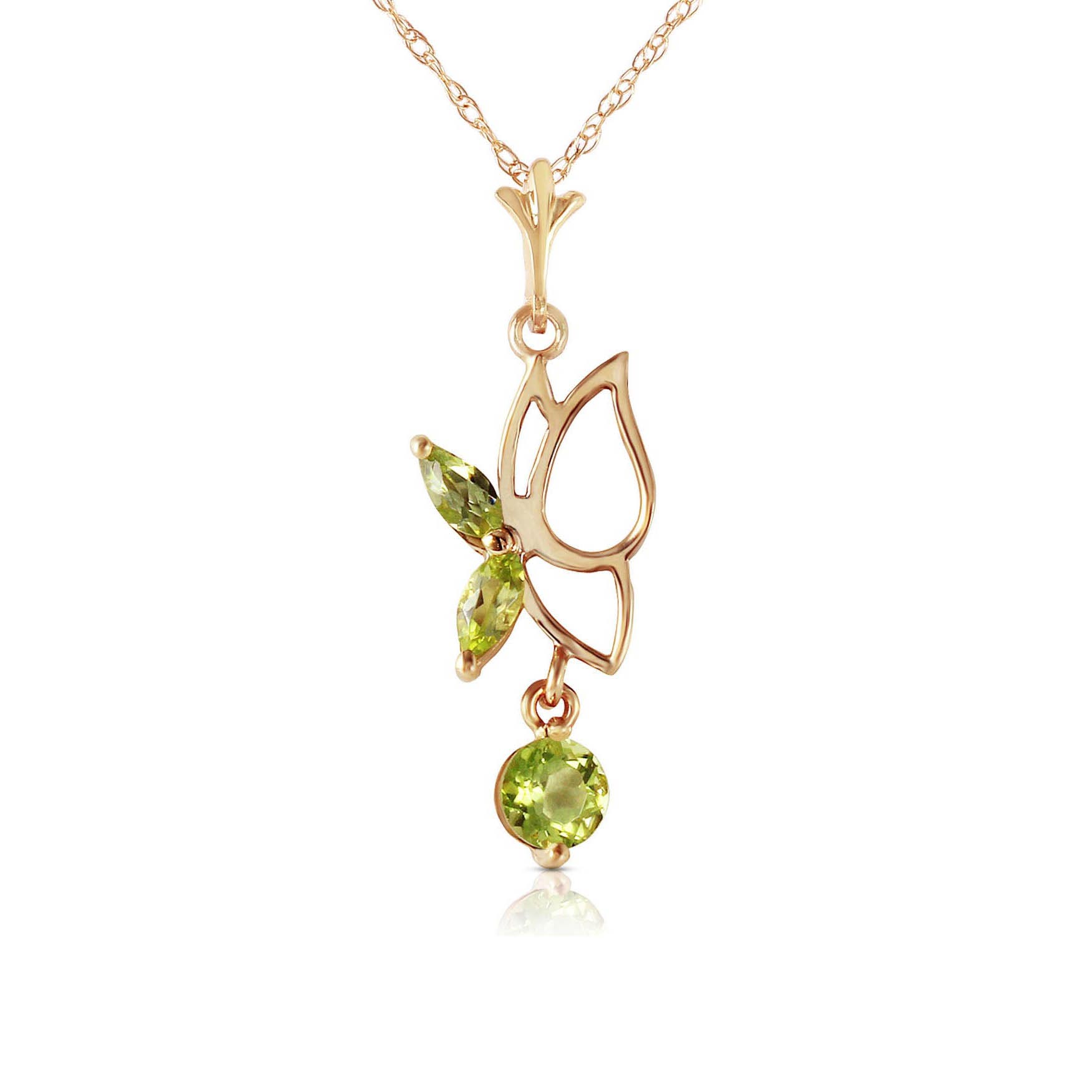 Peridot Butterfly Pendant Necklace handcrafted in solid 9ct gold. Three gemstones, total 0.4 ct. Marquise cut. The pendant hangs from a gold double link rope chain with spring clasp. Size: 8.4 x 26.4 mm (0.33 x 1.04 in). Material: 9ct Gold. Total metal weight: 1.54 gr. 2 marquise cut peridots (4 x 2 mm) = 0.18 ct total. 1 round cut peridot (4 x 4 mm) = 0.22 ct. Colour: Green. Stone cut: Marquise Cut. Anniversary: 16th Anniversary. Birthstone: August.
