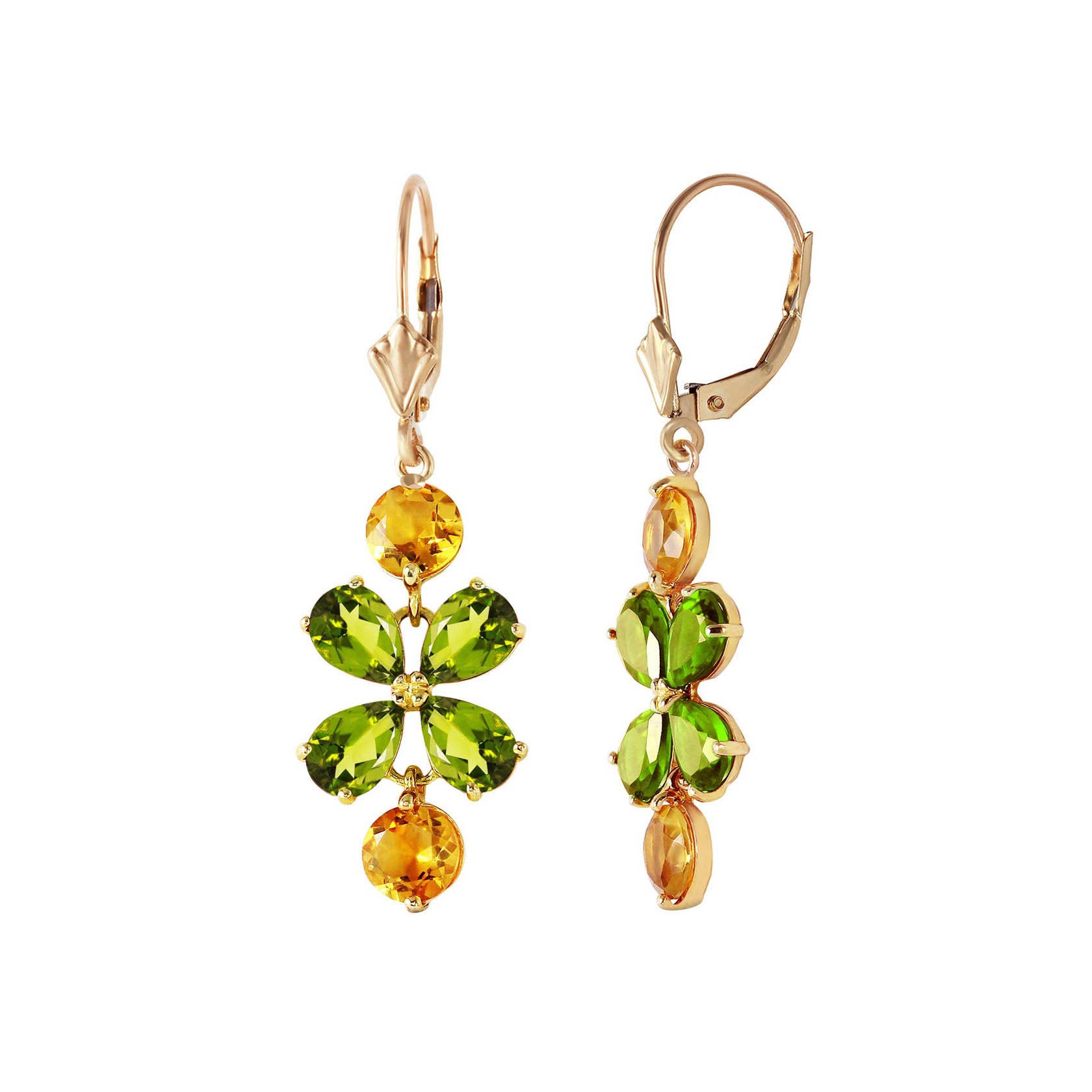 Peridot & Citrine Chandelier Earrings handcrafted in solid gold. Twelve gemstones, total 5.32 ct for both earrings combined. Pear cut. Size: 11.9 x 39.9 mm (0.47 x 1.57 in). Material: 9ct Gold. Total metal weight: 3.0 gr. 8 pear cut peridots (6 x 4 mm) = 3.25 ct total for pair. 4 round cut citrines (5 x 5 mm) = 2.07 ct total for pair. Colour: Green. Stone cut: Pear Cut. Anniversary: 16th Anniversary. Birthstone: August.