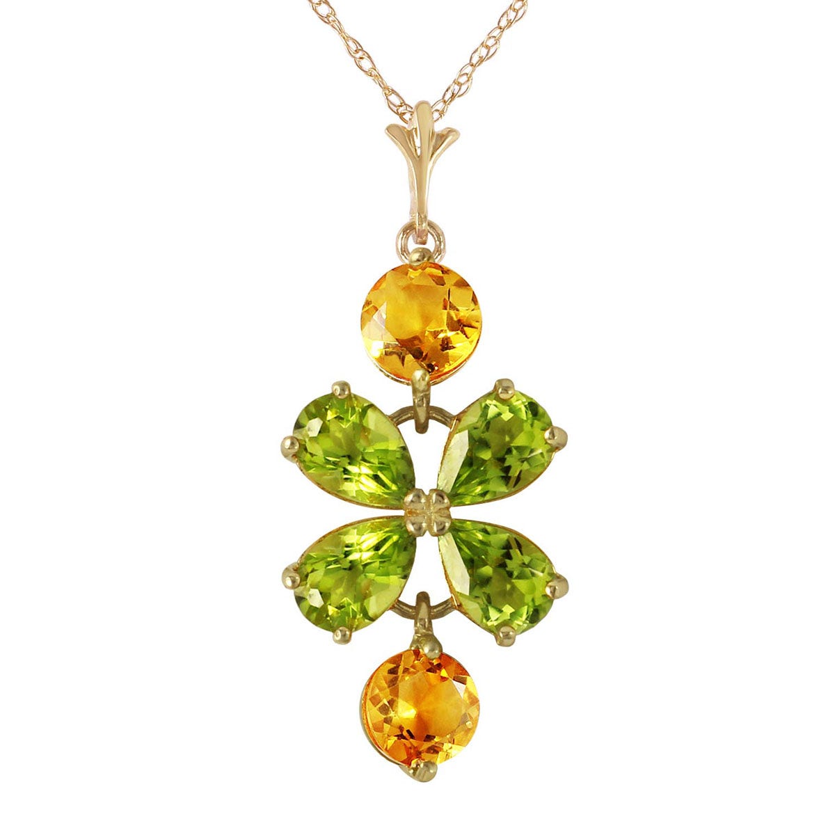 Peridot & Citrine Pendant Necklace handcrafted in solid gold. Six gemstones, total 3.15 ct. Pear cut. The pendant is suspended from a gold double link rope chain with spring clasp. Size: 11.9 x 30.5 mm (0.47 x 1.2 in). Material: 9ct Gold. Total metal weight: 2.34 gr. 4 pear cut peridots (6 x 4 mm) = 2.15 ct total. 2 round cut citrines (5 x 5 mm) = 1 ct total. Colour: Green. Stone cut: Pear Cut. Anniversary: 16th Anniversary. Birthstone: August.