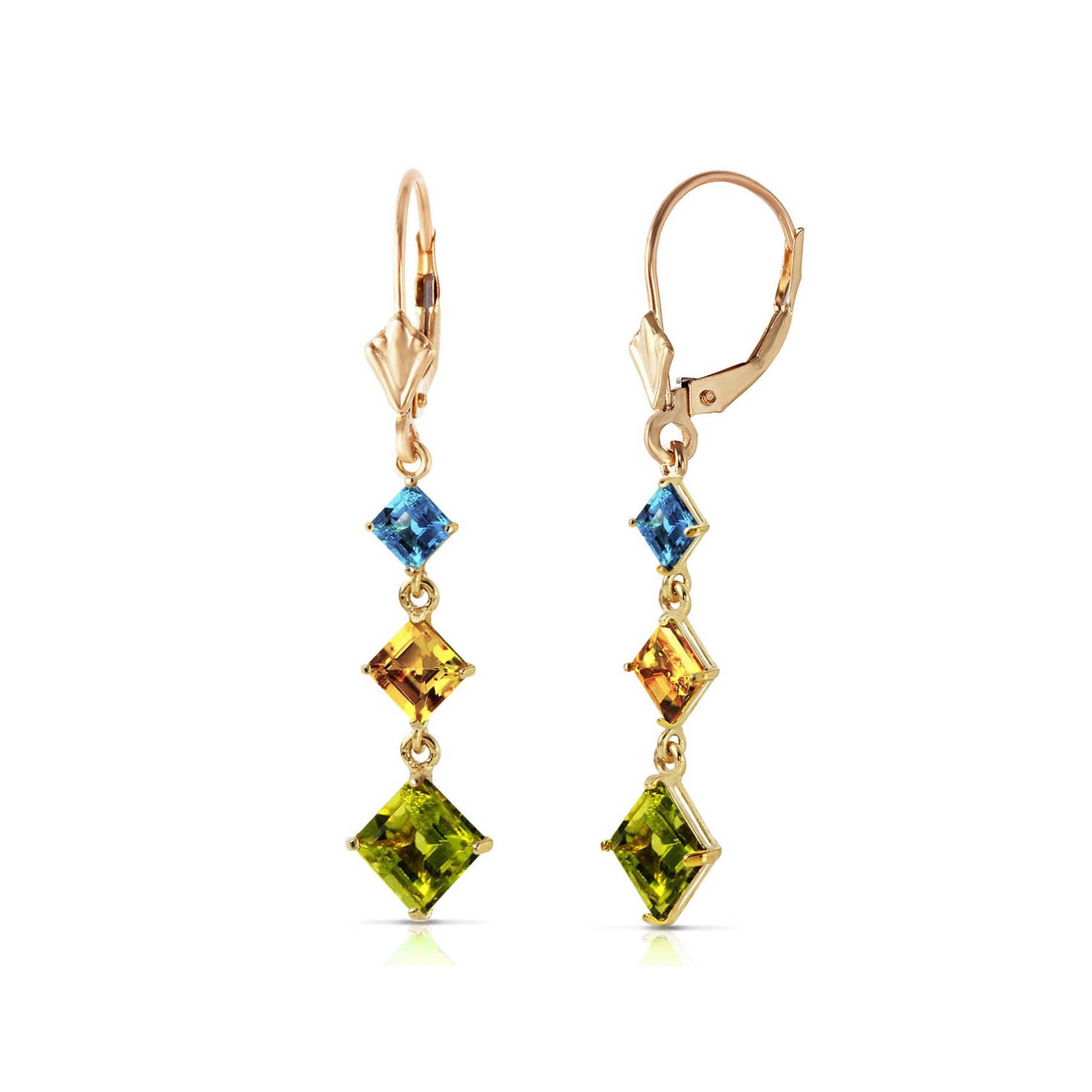 Peridot, Citrine & Blue Topaz Chandelier Earrings handcrafted in solid gold. Six gemstones, total 4.8 ct for both earrings combined. Square cut. Size: 9.4 x 43.4 mm (0.37 x 1.71 in). Material: 9ct Gold. Total metal weight: 2.6 gr. 2 square cut peridots (6 x 6 mm) = 2.3 ct total for pair. 2 square cut citrines (5 x 5 mm) = 1.5 ct total for pair. 2 square cut blue topaz (4 x 4 mm) = 1 ct total for pair. Colour: Green. Stone cut: Square Cut. Anniversary: 16th Anniversary. Birthstone: August.